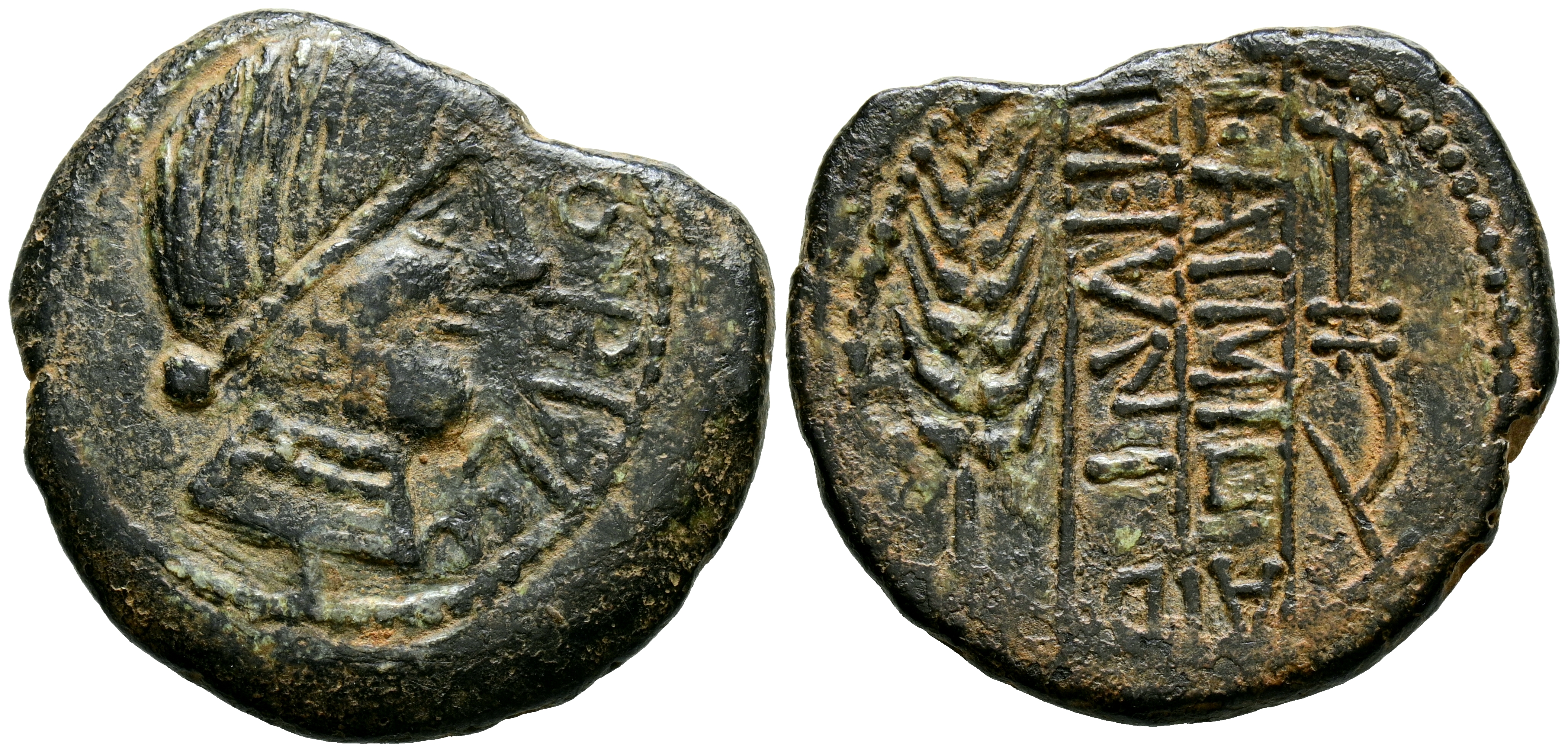 OBULCO (Porcuna, Jaén). As. (Ae. 10,66g/30mm). 220-20 a.C. (FAB-1815). Anv: Cabeza femenina a derecha, delante leyenda externa: OBVLCO, detrás creciente y letra ibérica Ta. Rev: Arado a derecha, debajo espiga a izquierda, entre ellos leyenda: L AIMIL/ M IVNI/ AID. MBC-. Cospel faltado.