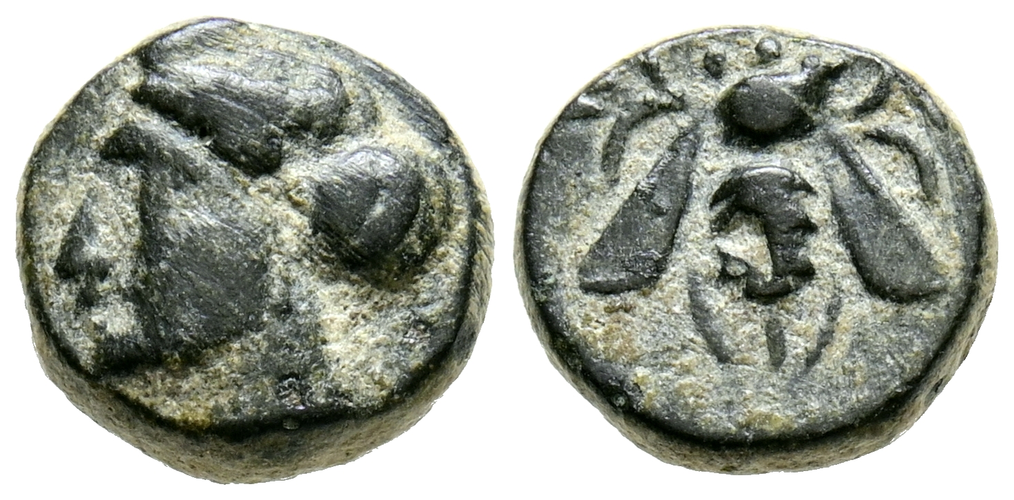 JONIA, Efesos. Ae10. (Ae. 1,31g/10mm). 375-325 a.C. (SNG Copenhague 256). Anv: Cabeza femenina a izquierda. Rev: Abeja entre las letras: E-Φ. MBC.