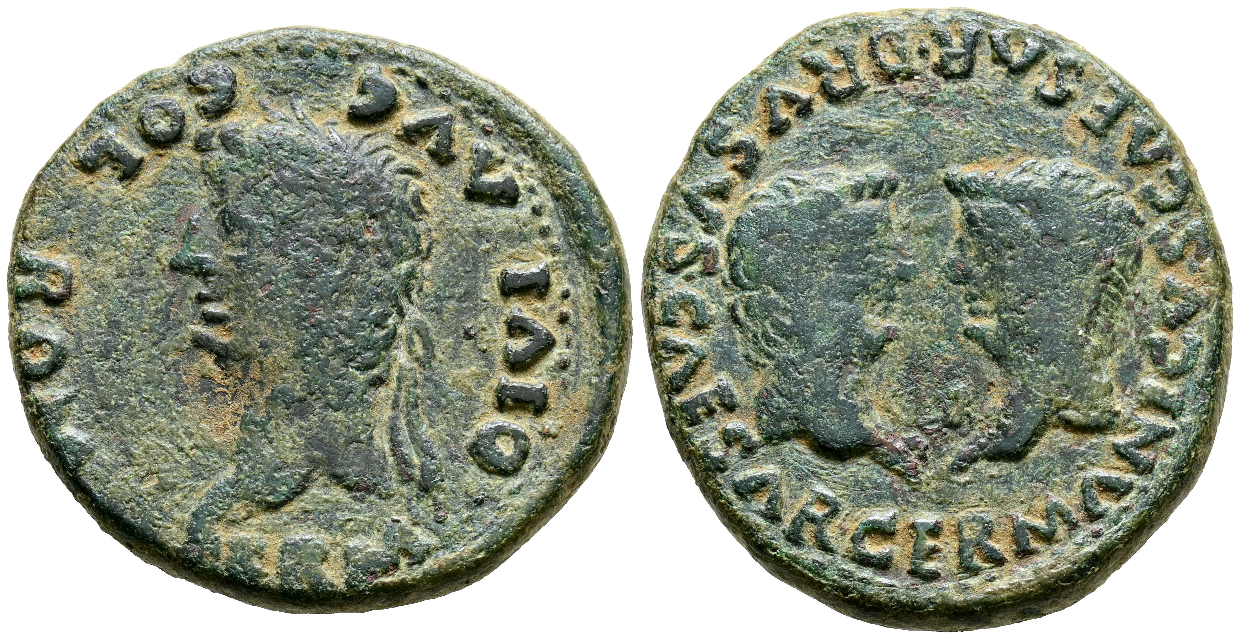 COLONIA ROMULA (Sevilla). As. (Ae. 13,18g/30mm). 27 a.C.-14 d.C. (FAB-2016). Anv: Cabeza laureada de Tiberio a izquierda, alrededor leyenda: PERM DIVI AVG COL ROM. Rev: Cabezas de Germánico y Druso enfrentadas, alrededor leyenda: CAESAR GERMANICVS CAESAR DRVSVS. MBC-.