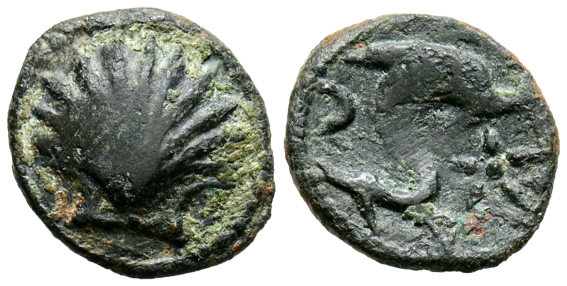 ARSE-SAGUNTO (Sagunto, Valencia). Sextante. (Ae. 1,40g/13mm). 170-20 a.C. (FAB-2064). Anv: Concha. Rev: Delfín, encima creciente, debajo letras Ibéricas A y estrella. MBC.