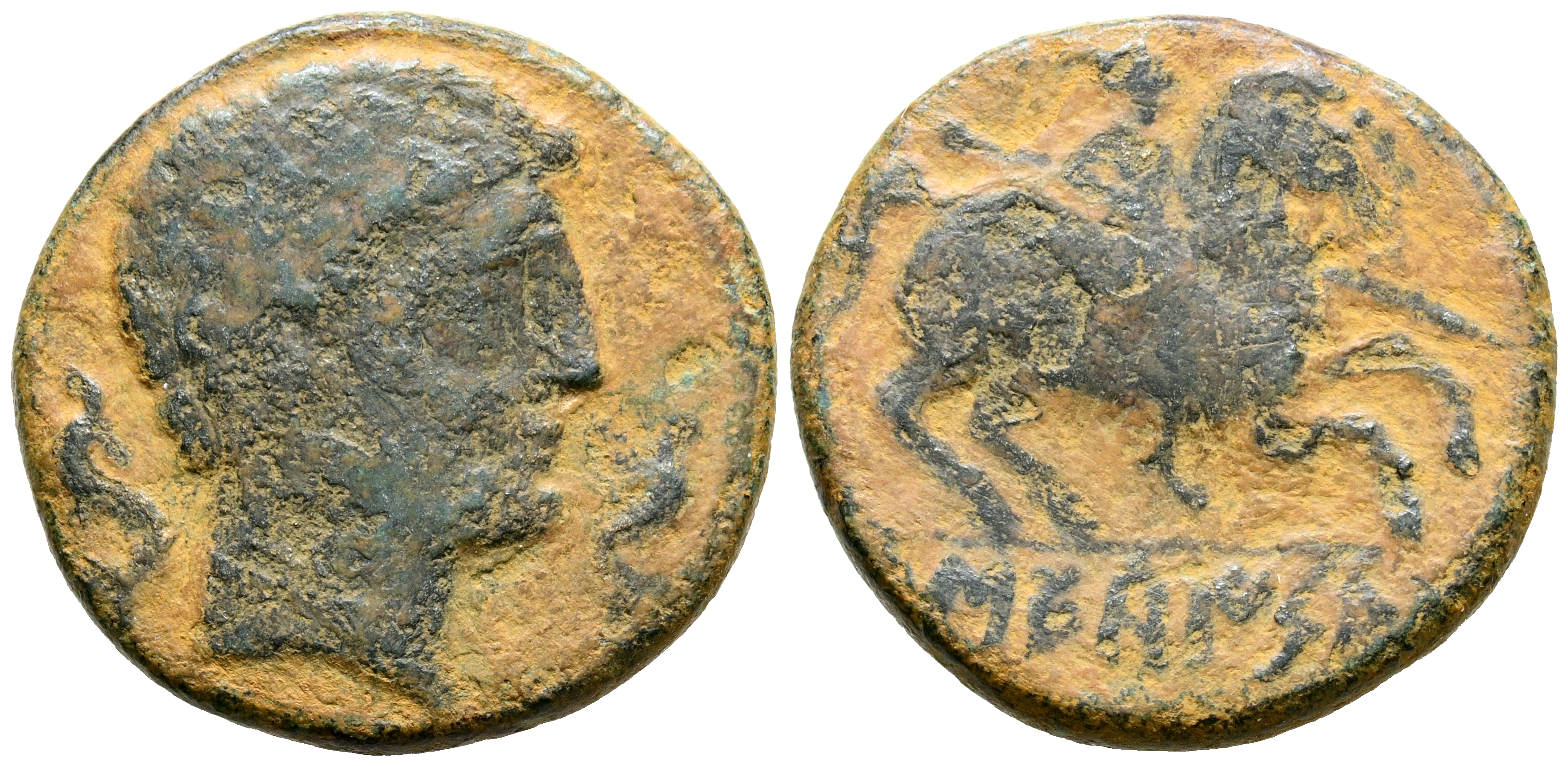 SECAISA (Segeda, Zaragoza). As. (Ae. 8,46g/23mm). 120-20 a.C. (FAB-2131). Anv: Cabeza masculina a derecha, entre dos delfines. Rev: Jinete con lanza a derecha, debajo leyenda ibérica: SECaISA. MBC-/MBC.