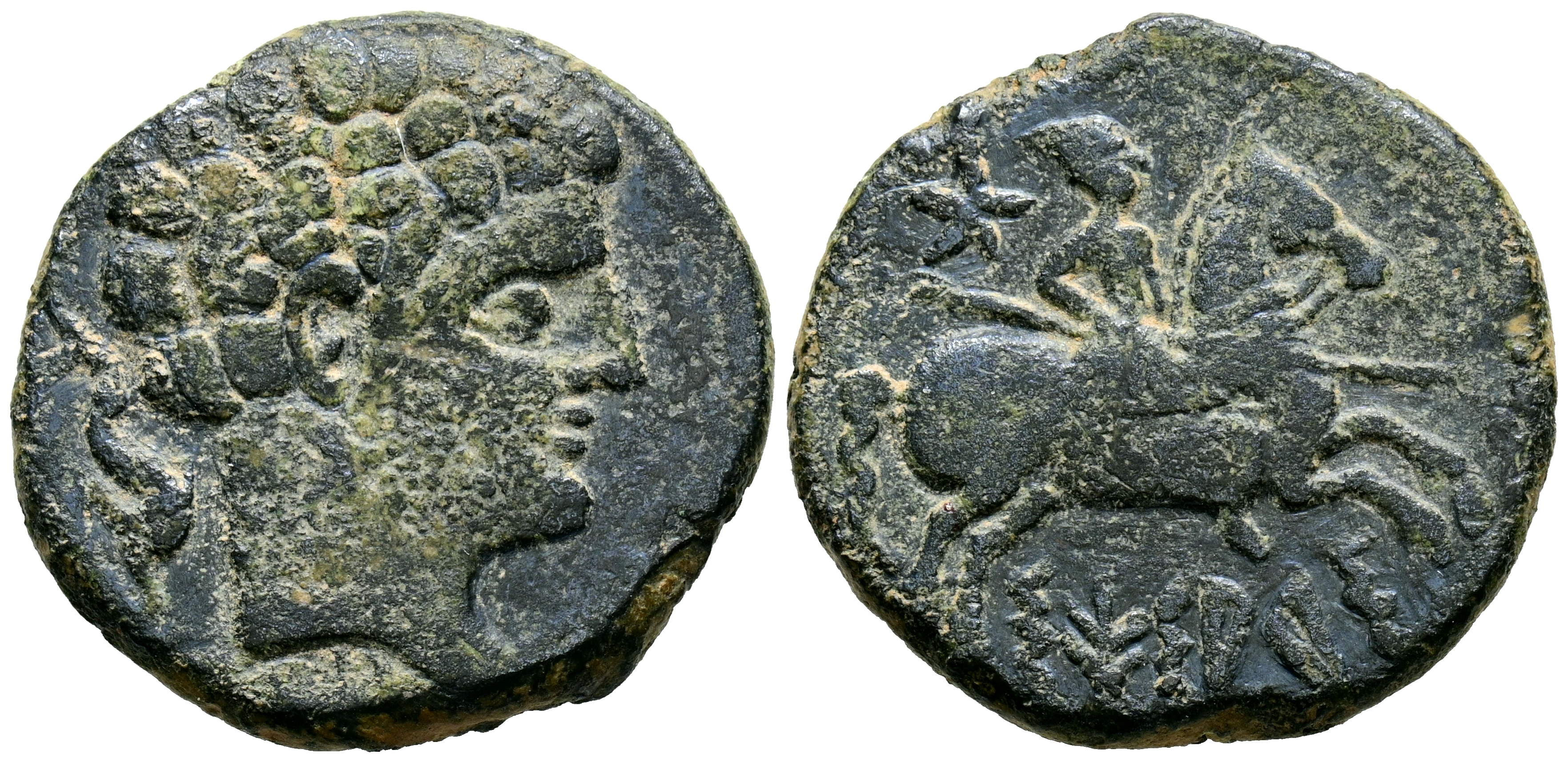 SESARS (Zona de Aragón). As. (Ae. 8,92g/25mm). 120-20 a.C. (FAB-2198). Anv: Cabeza masculina barbada a derecha, detrás delfín. Rev: Jinete con lanza a derecha, encima estrella, debajo leyenda ibérica: SESARS. MBC-.