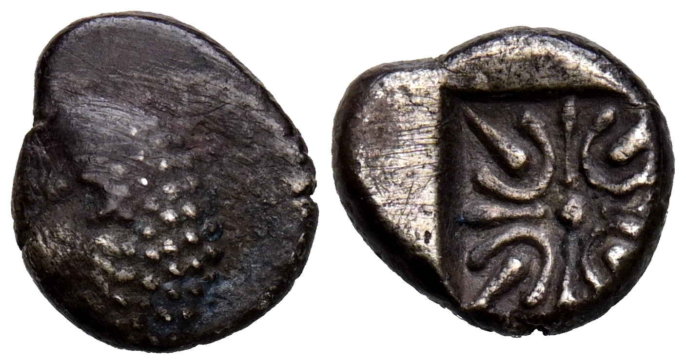 JONIA, Miletos. Obolo. (Ar. 1,02g/10mm). Siglo VI-Siglo V a.C. (SNG kayhan 476/82). Anv: Parte delantera de león a izquierda. Rev: Patrón estelar incuso. MBC.