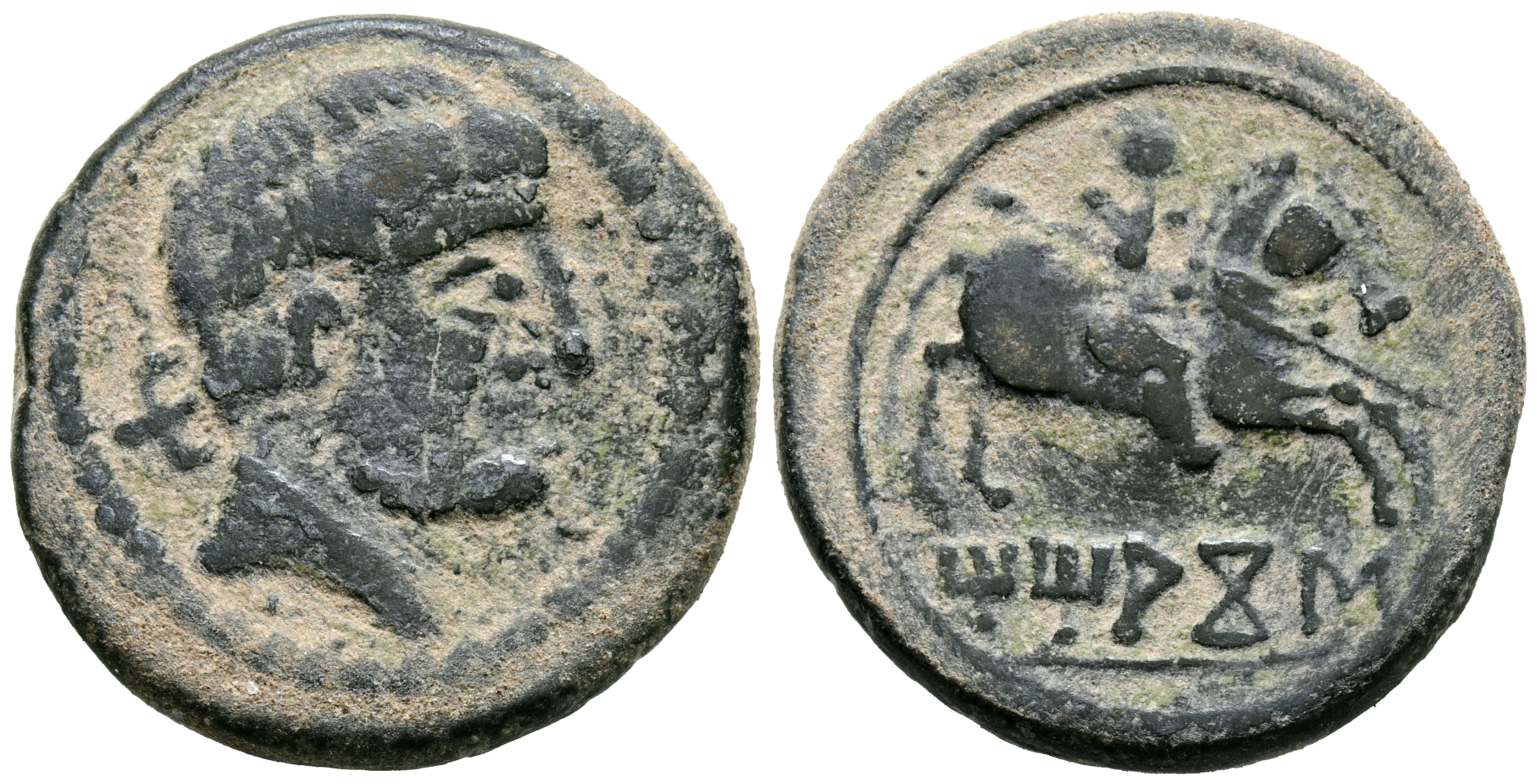 TITIACOS (Tricio, La Rioja). As. (Ae. 8,75g/24mm). 120-20 a.C. (FAB-2392). Anv: Cabeza masculina barbada a derecha, detrás letrá: Ti. Rev: Jinete con lanza a derecha, debajo leyenda ibérica: TiTiACoS. MBC-.