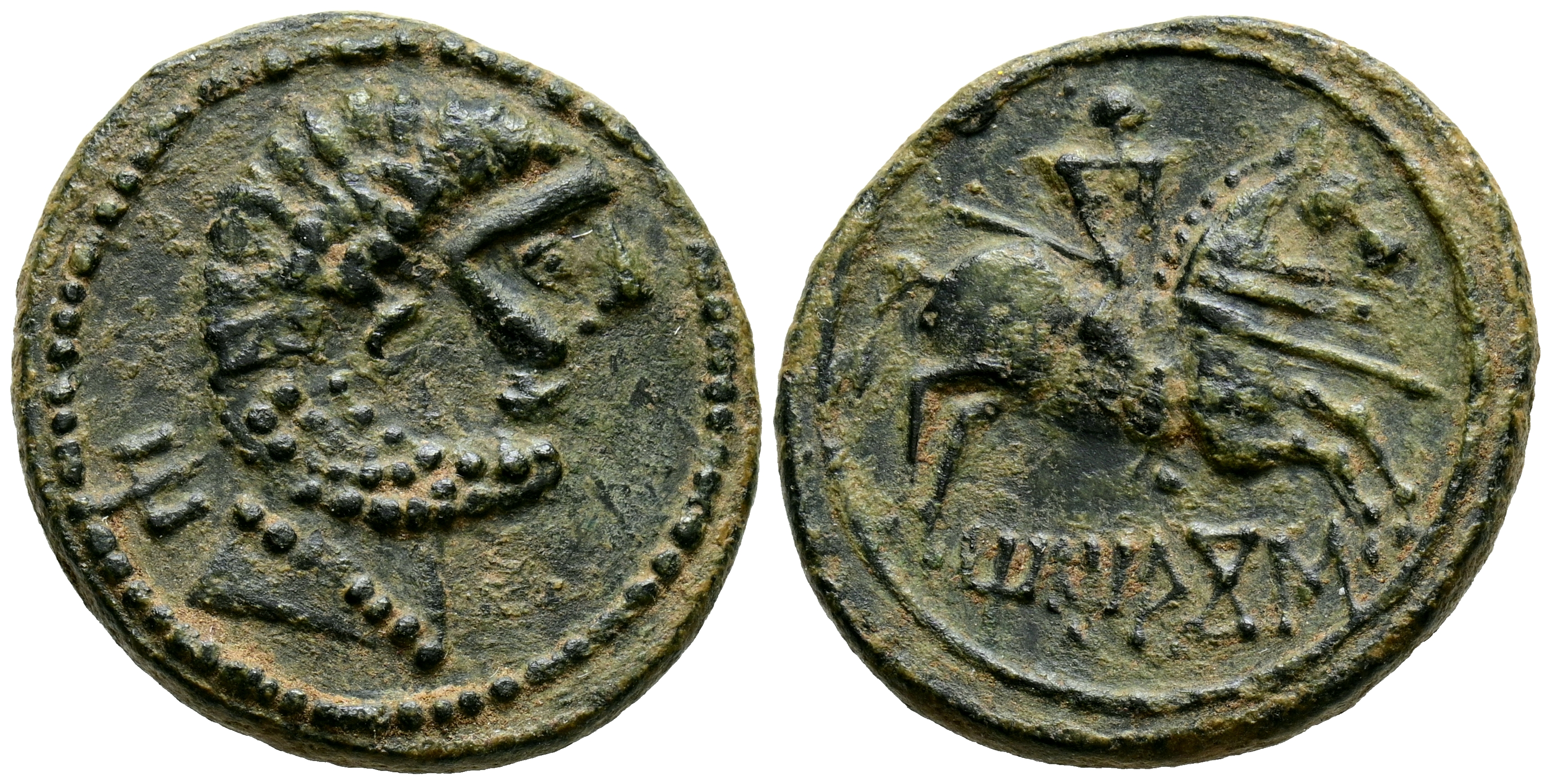 TITIACOS (Tricio, La Rioja). As. (Ae. 8,94g/25mm). 120-20 a.C. (FAB-2394). Anv: Cabeza masculina barbada a derecha, detrás letra ibérica: Ti. Rev: Jinete con lanza a derecha, debajo leyenda ibérica: TiTiACoS. MBC+. Campos ligeramente repasados.