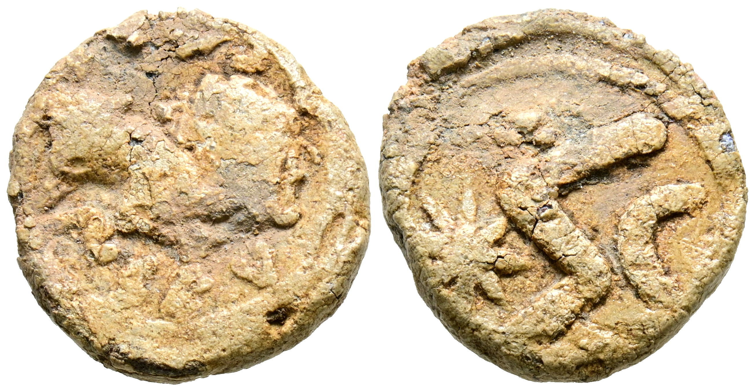 PLOMOS DEIVERSOS DE MEDIANO MODULO. Plomo monetiforme. (Pb. 5,43g/19mm). (CCP pág. 39, nº 2', catalogado como RRR). Anv: Cabeza masculina a derecha, detrás letras ibéricas: SI, delante: RBaISER. Rev: Letra ibérica: S, entre estrella y creciente. MBC-. Muy raro ejemplar. Ex Soler y Llach & Martí Hervera, Subasta 1059 (20/04/2010), Nº Lote 2209.