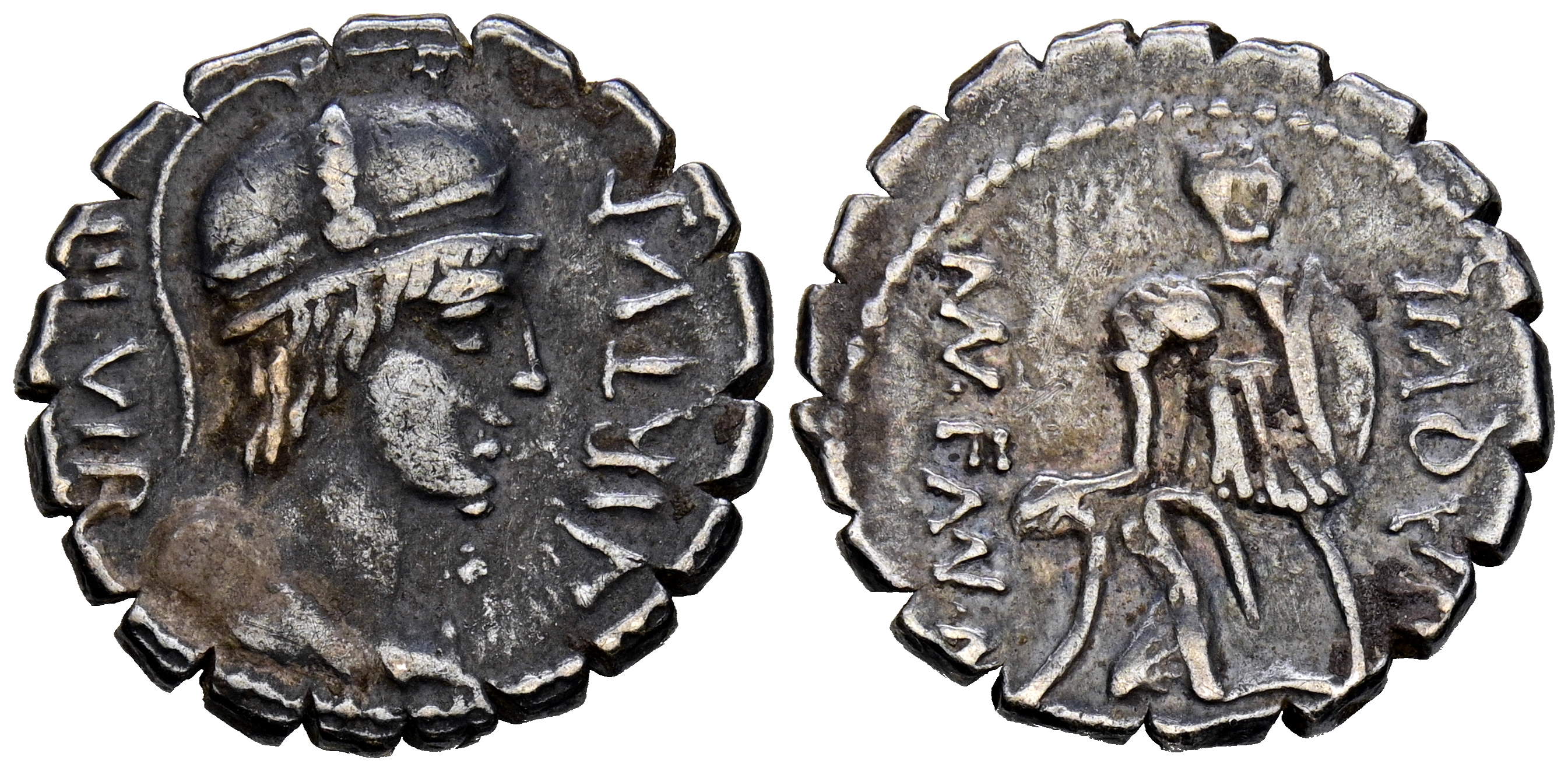 GENS AQUILLIA. Denario. (Ar. 3,89g/19mm). 71 a.C. Ceca incierto. (FFC 167; Crawford 401/1). Anv: Busto de Virtus a derecha, alrededor leyenda: III VIR VIRTVS. Rev: Cónsul Man. Aquillius estante a izquierda incorporando a Sicilia, alrededor leyenda: MN AQVIL MN F MN V, en exergo: SICIL. MBC+. Pátina oscura.