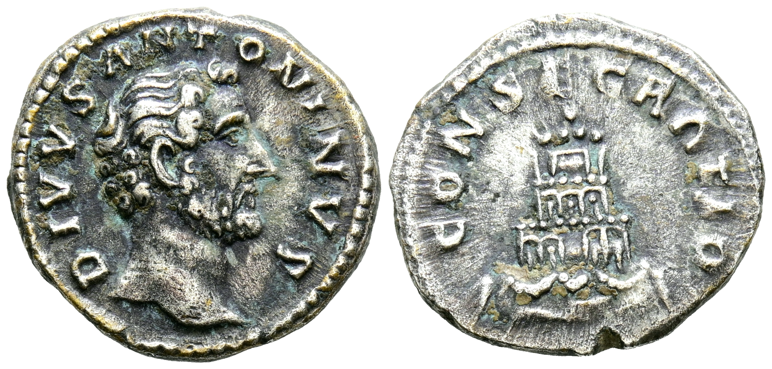 DIVO ANTONINO PIO. Denario. (Ar. 3,33g/18mm). 161 d.C. Roma. (RIC 436). Anv: Cabeza de Antonino Pío a derecha, alrededor leyenda: DIVVS ANTONINVS. Rev: Pira funeraria sobre cuatro escalera de cuatro niveles decorada, alrededor leyenda: CONSECRATIO. MBC.