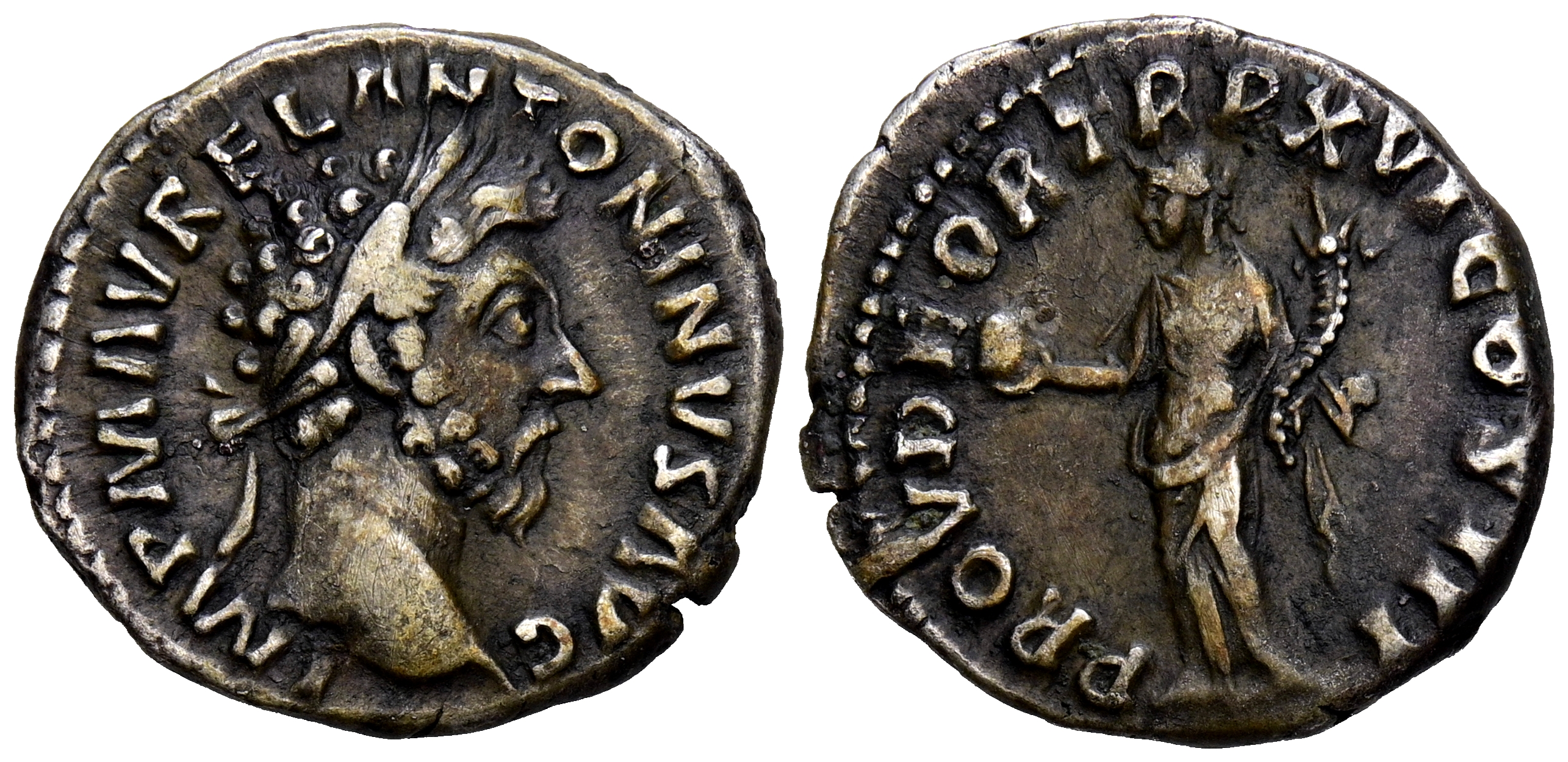 MARCO AURELIO. Denario. (Ar. 3,09g/18mm). 161-180 d.C. Roma. (RIC 51). Anv: Cabeza de Marco Aurelio a derecha, alrededor leyenda: IMP M AVREL ANTONINVS AVG. Rev: Providencia estante a la izquierda sosteniendo un globo en la mano derecha y cornucopia en la izquierda, alrededor leyenda: PROV DEOR TR P XVI COS III. MBC.