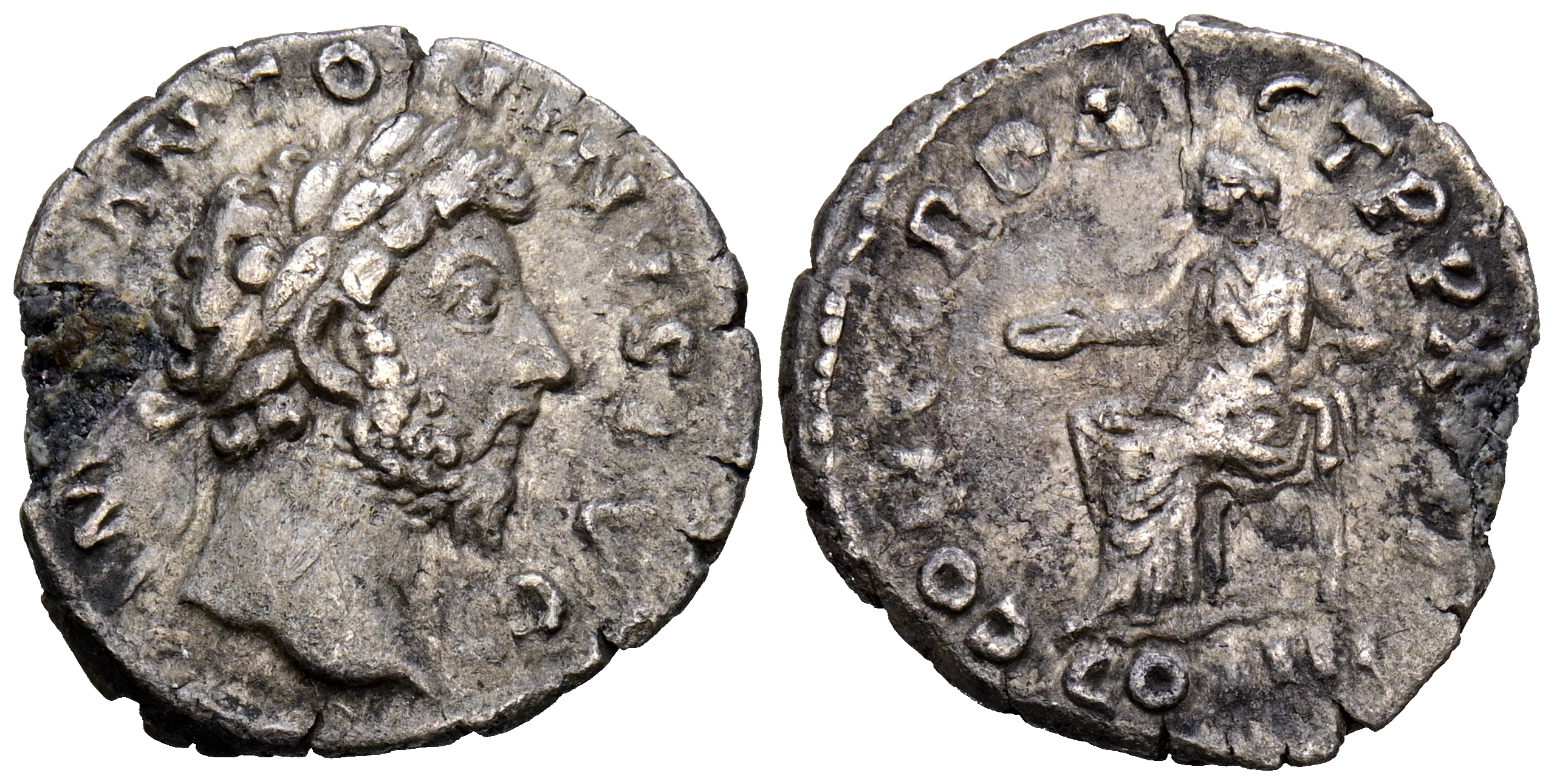 MARCO AURELIO. Denario. (Ar. 2,44g/18mm). 162-163 d.C. Roma. (RIC 59). Anv: Cabeza de Marco Aurelio a derecha, alrededor leyenda: IMP M ANTONINVS AVG. Rev: Concordia sentada a izquierda portando patera con el hombro sobre estatua de Spes, en exergo: COS III, alrededor leyenda: CONCORD AVG TR P XVII. MBC-. Cospel faltado.