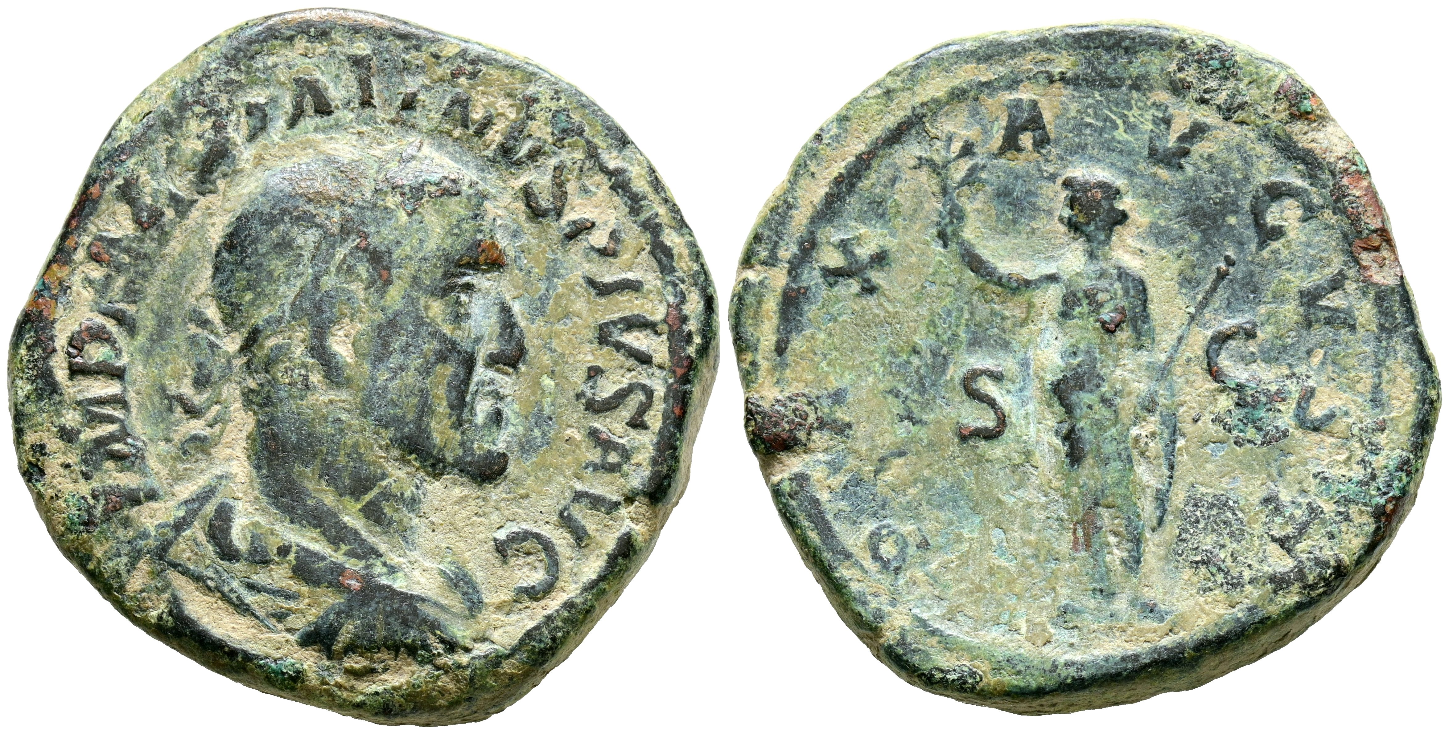 MAXIMINO I. Sestercio. (Ae. 26,93g/33mm). 235-236 d.C. Roma. (RIC 58). Anv. Busto laureado, drapeado y con coraza de Maximino I a derecha, alrededor leyenda: IMP MAXIMINVS PIVS AVG. Rev: Pax estante a izquierda portando cetro y rama, entre: S-C, alrededor leyenda: PAX AVGVSTI. MBC.