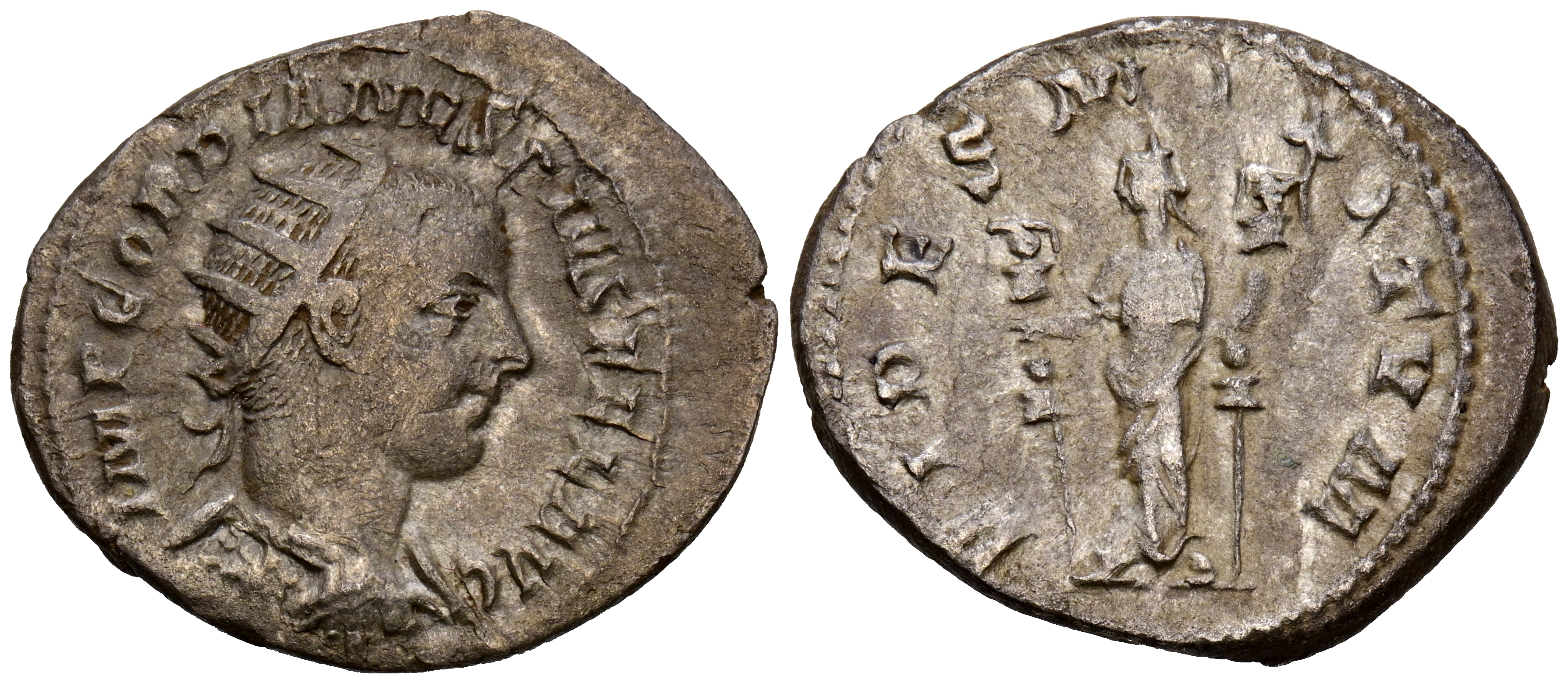 GORDIANO III. Antoniniano. (Ar. 4,42g/25mm). 243 d.C. Roma. (RIC 209b). Anv: Busto radiado, drapeado y con coraza de Gordiano III a derecha, alrededor leyenda: IMP GORDIANVS PIVS FEL AVG. Rev: Fides estante a izquierda portando dos estandartes, alrededor leyenda: FIDES MILITVM. MBC.