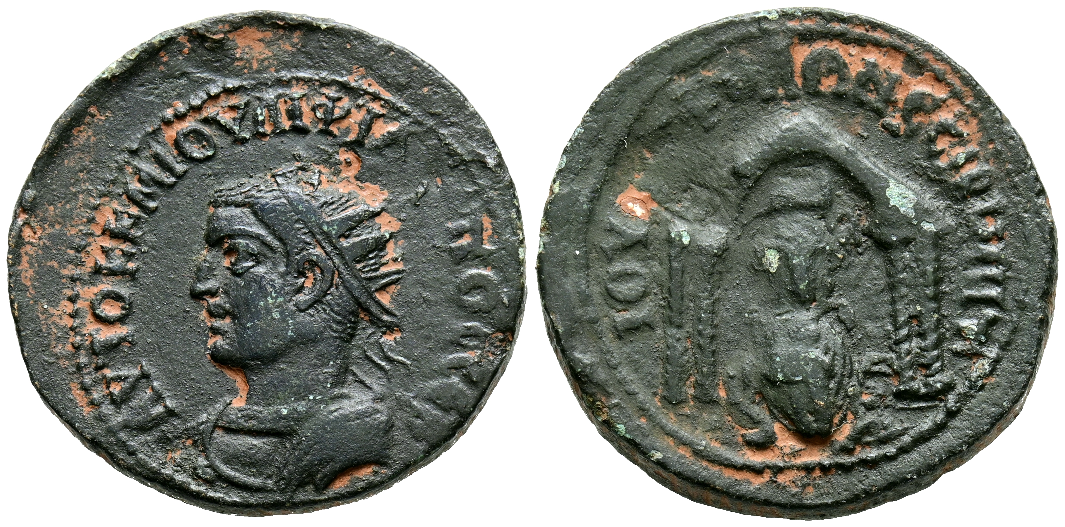 FILIPO II. Ae25. (Ae. 11,31g/25mm). 247-249 d.C. Nísibis, Mesopotamia. (RIC 1962). Anv: Busto radiado, drapeado y acorazado de Filipo II a la izquierda, alrededor leyenda: AYTOK M IOVΛI ΦIΛIΠΠOC CЄB. Rev: Tyche de Antioquía sentada de frente; arriba , carnero saltando a la derecha, todo dentro de templo tetrástilo; abajo, dios-río Éufrates nadando a la derecha, alrededor leyenda: IOY CЄΠ KOΛΩ NЄCIBI MHT. MBC.