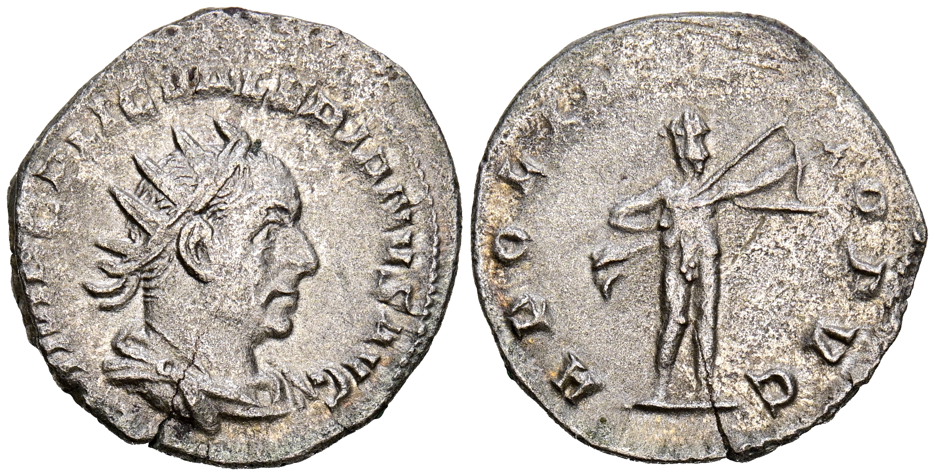 VALERIANO I. Antoniniano. (Ar. 3,05g/22mm). 253 d.C. Roma. (RIC 74). Anv: Busto radiado y drapeado de Valeriano I a derecha, alrededor leyenda: IMP C P LIC VALERIANVS AVG. Rev: Apolo estante a derecha apuntando con arco tensado, alrededor leyenda: APOLINI PROPVG. MBC.