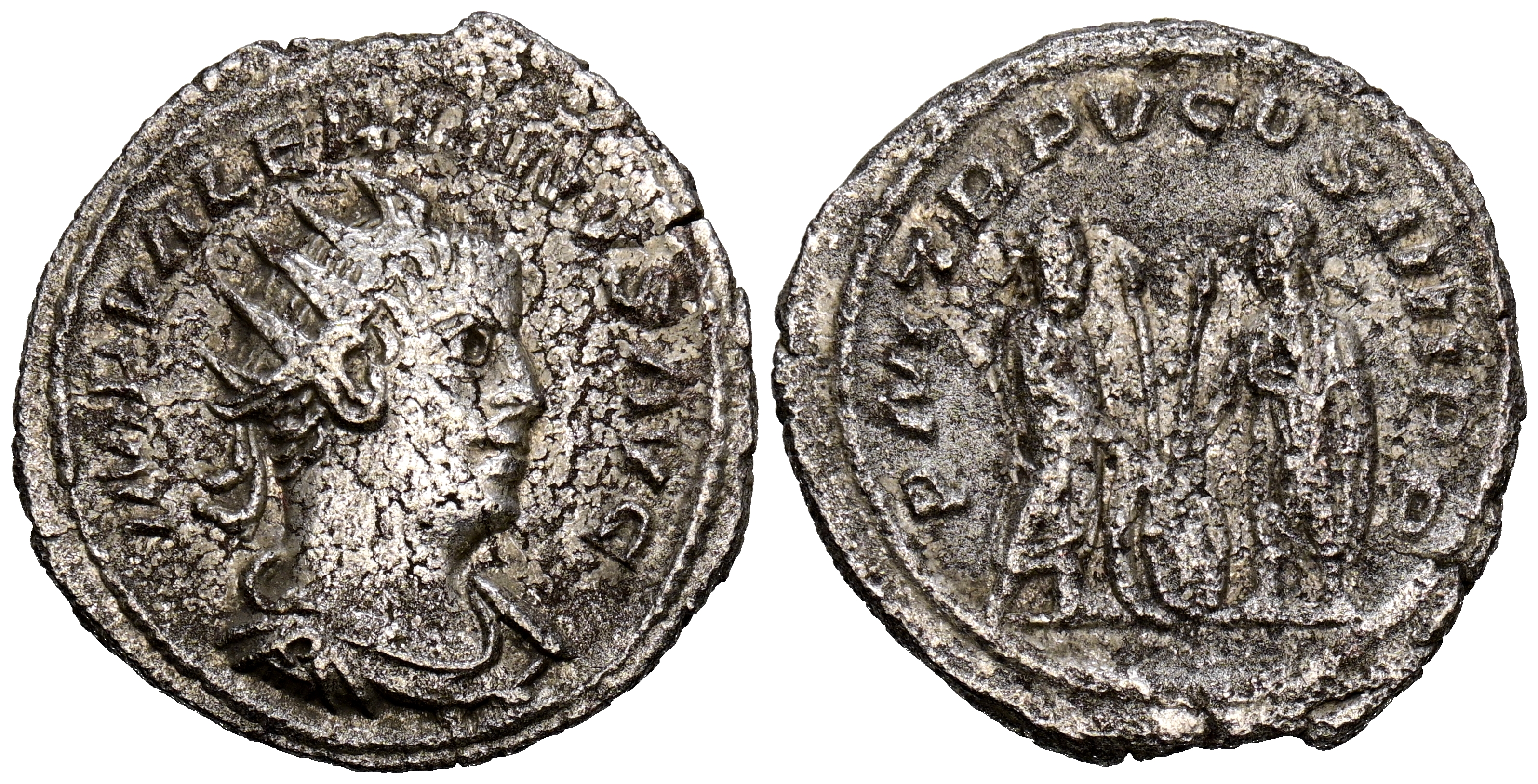 VALERIANO I. Antoniniano. (Ar. 3,51g/23mm). 257 d.C. Antioquía. (RIC 277). Anv: Busto radiado y drapeado con coraza a derecha, alrededor leyenda: IMP VALERIANVS AVG. Rev: Valeriano y Galieno, uno frente al otro sosteniendo escudos entre ellos, ambos portando lanzas, alrededor leyenda: P M TR P V COS IIII P P. MBC+. Plata agria.