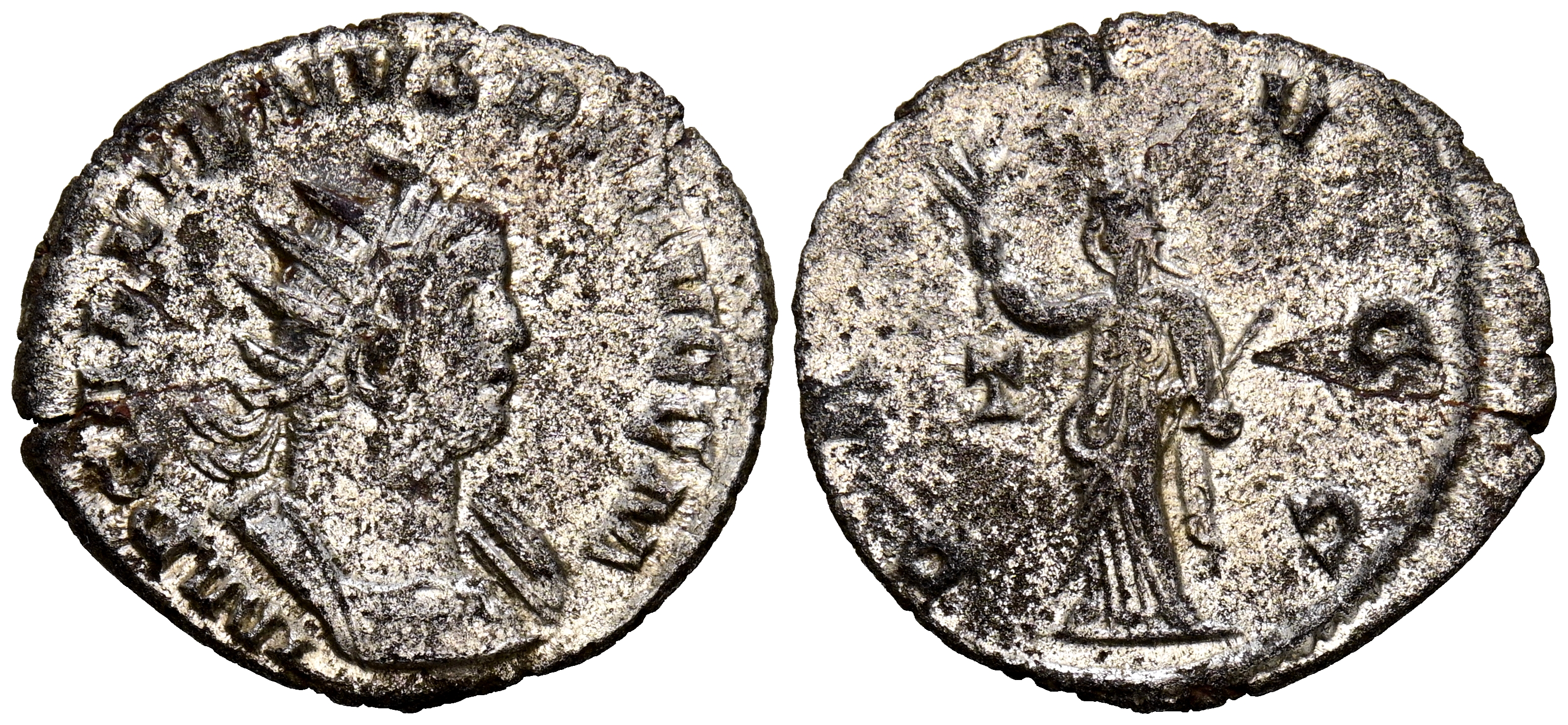 GALIENO. Antoniniano. (Ar. 4,09g/23mm). 257 d.C. Roma. (RIC 157). Anv: Busto radiado y con coraza de Galieno a derecha, alrededor leyenda: IMP GALLIENVS P F AVG G M. Rev: Pax estante a izquierda portando rama y cetro, en campo: T, alrededor leyenda: PAC AVGG. MBC. Restos de plateado original.
