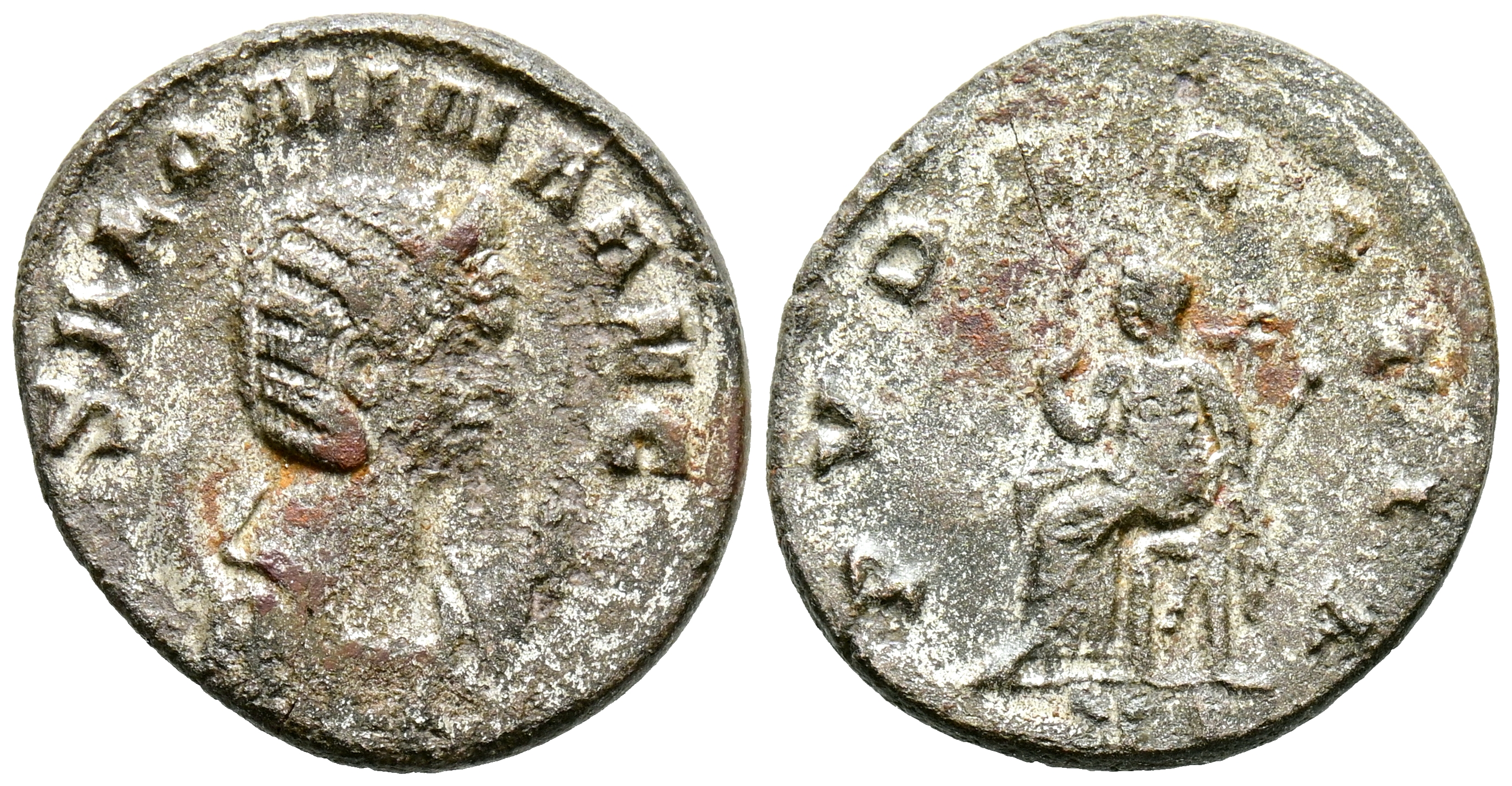 SALONINA. Antoniniano. (Ve. 2,91g/24mm). 260-262 d.C. Roma. (RIC 25). Anv: Busto diademado y drapeado de Salonina sobre creciente a derecha, alrededor leyenda: SALONINA AVG. Rev: Pudicitia sedente a izquierda portando cetro, en exergo: VI, alrededor leyenda: PVDICITIA. MBC.