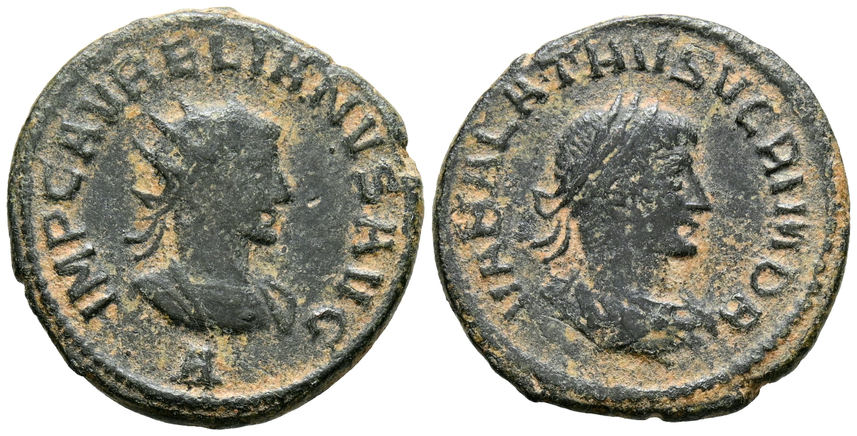 AURELIANO y VABALATO. Antoniniano. (Ae. 3,58g/21mm). 270-272 d.C. Antioquia. (RIC 381). Anv: Busto radiado y drapeado de Aureliano a derecha, debajo S, alrededor leyenda: IMP C AVRELIANVS AVG. Rev: Busto laureado y drapeado de Vabalato a derecha, alrededor leyenda: VABALATHVS V C R IM D R. MBC.