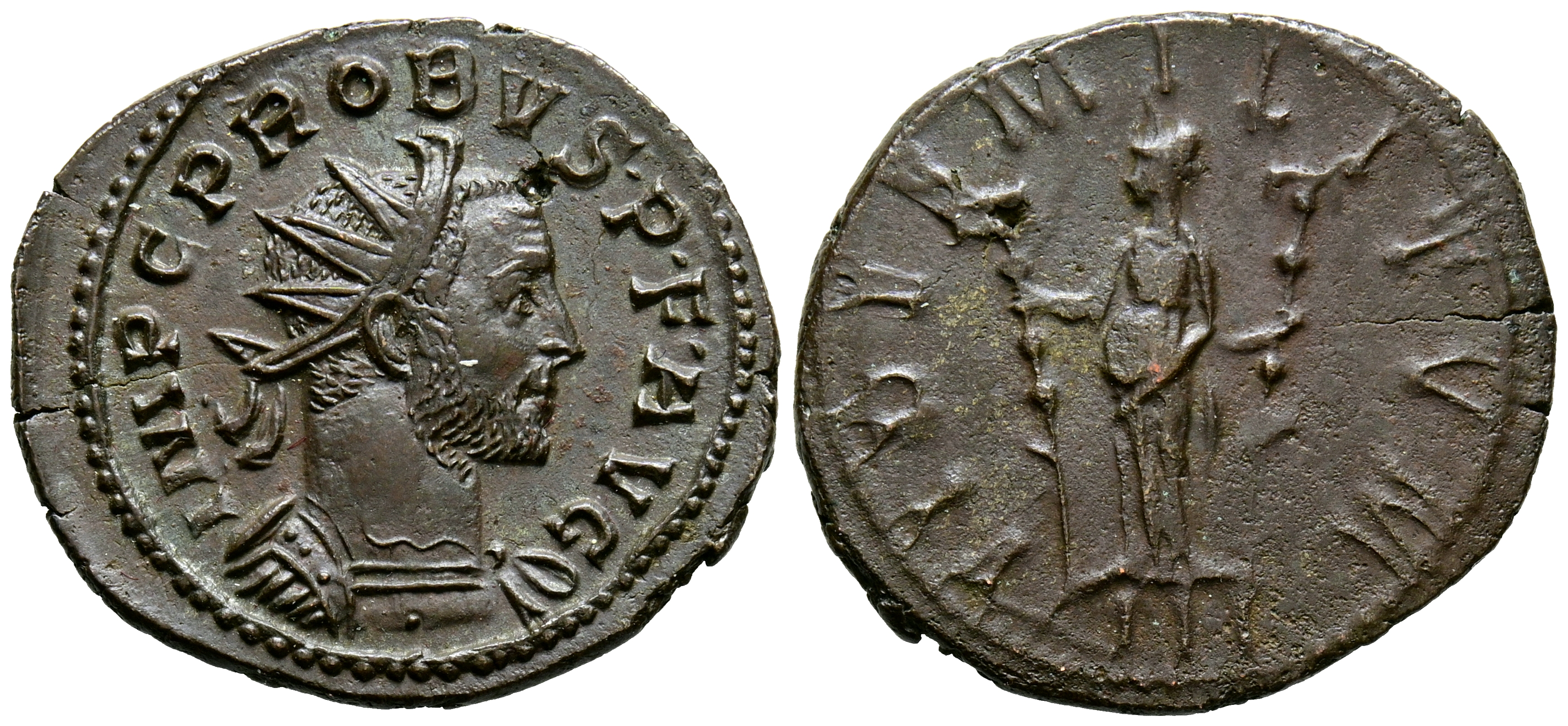 PROBO. Antoniniano. (Ae. 4,00g/25mm). 278-279 d.C. Lugdunum. (RIC 80). Anv: Busto radiado y con coraza de Probo a derecha, alrededor leyenda: IMP C PROBVS P F AVG. Rev: Fides estante a izquierda portando dos estandartes, en exergo: III, alrededor leyenda: FIDES MILITVM. EBC/MBC. Hoja fuerte.