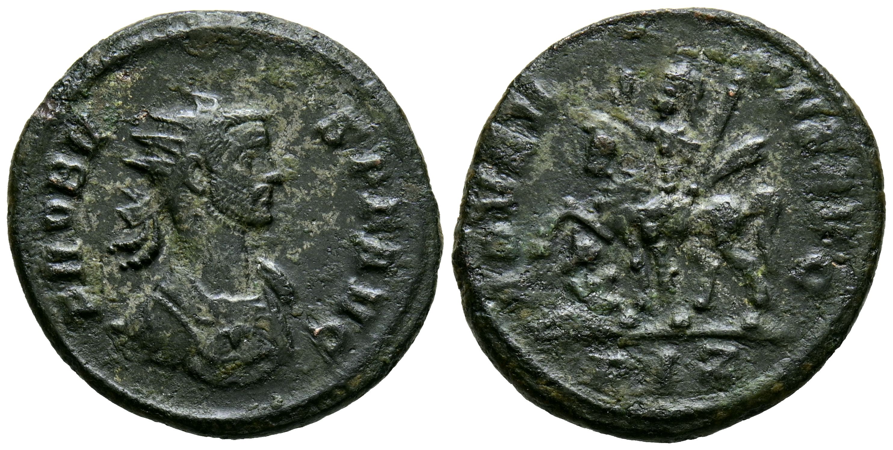 PROBO. Antoniniano. (Ve. 3,79g/21mm). 280 d.C. Roma. (RIC 158). Anv: Busto radiado con coraza de Probo a derecha, alrededor leyenda: PROBVS P F AVG. Rev: Probo a caballo a izquierda, levantando la mano derecha en y sosteniendo el cetro largo en la izquierda; a la izquierda en el suelo, cautivo atado, en exergo: RIZ, alrededor leyenda: ADVENTVS AVG. MBC/MBC-.