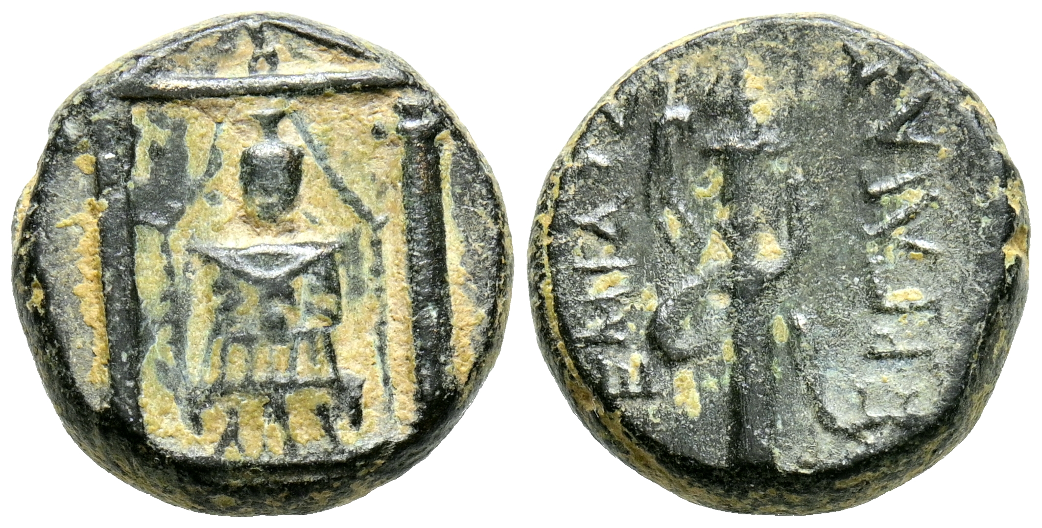 PAMPHYLIA, Perge. Ae15. (Ae. 4,03g/15mm). 50-30 a.C. (SNG France 373-8). Anv: Estatua de Artemis sentada en trono de frente dentro de templo. Rev: Arco y carcaj, alrededor leyenda griega: ΑΡΤΕΜΙΔOΣ / ΠΕΡΓΑΙΑΣ. MBC.