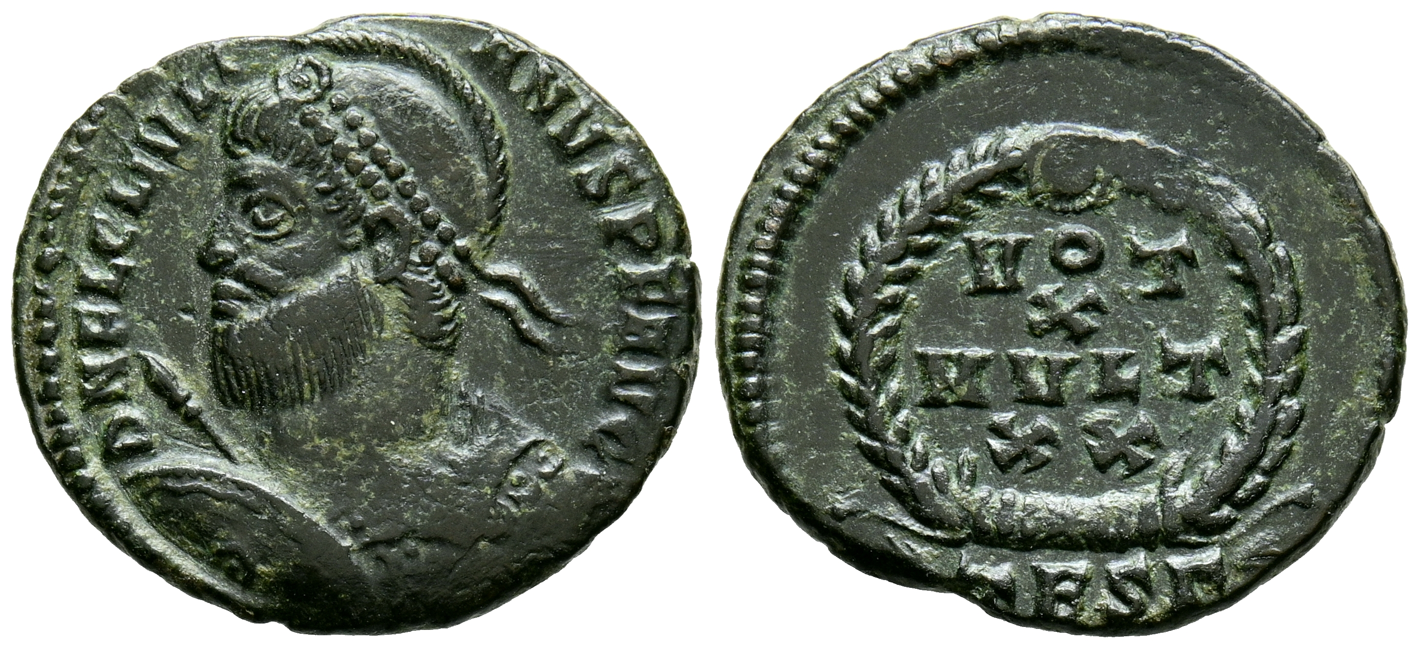 JULIANO II. Follis. (Ae. 2,96g/20mm). 361-363 d.C. Tesalónica. (RIC 227). Anv: Busto diademado con casco y coraza de Juliano II a izquieda portando escudo y lanza, alrededor leyenda: DN FL CL IVLIANVS P F AVG. Rev: Leyenda: VOT/X/MVLT/XX, dentro de c orona de laurel, debajo: TESΓ, entre dos palmas. MBC+.