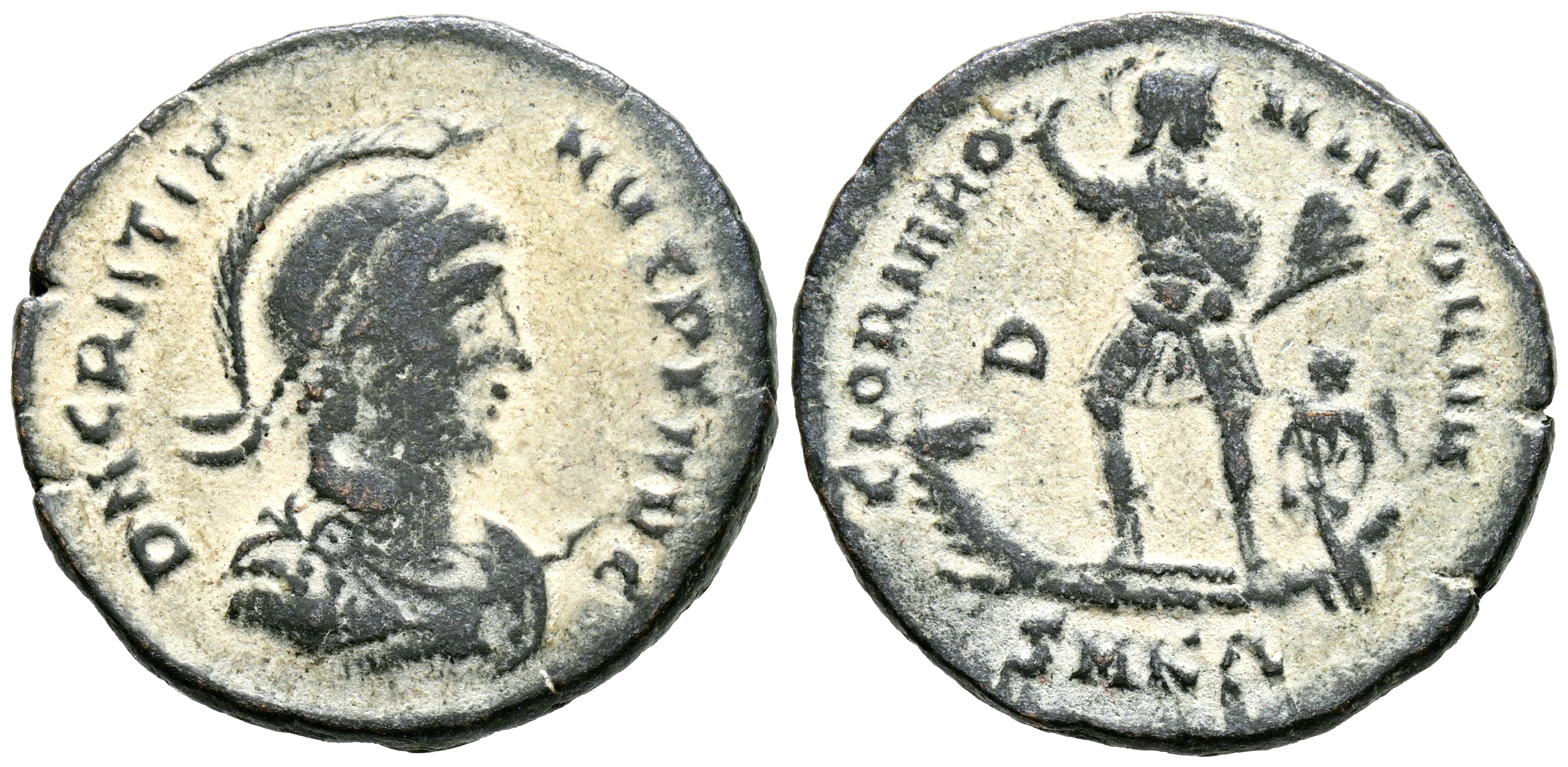 GRACIANO. Maiorina. (Ae. 5,43g/24mm). 378-383 d.C. Nicomedia. (RIC 14a). Anv: busto con casco, diademado, drapeado y con coraza de Graciano a derecha sosteniendo lanza y escudo, alrededor leyenda: DN GRATIANVS P F AVG. Rev: Graciano estante a la izquierda en proa levantando la mano derecha, Victoria sentada al timón, en campo D, en exergo: SMNA, alrededor leyenda: GLORIA ROMANORVM. MBC-.