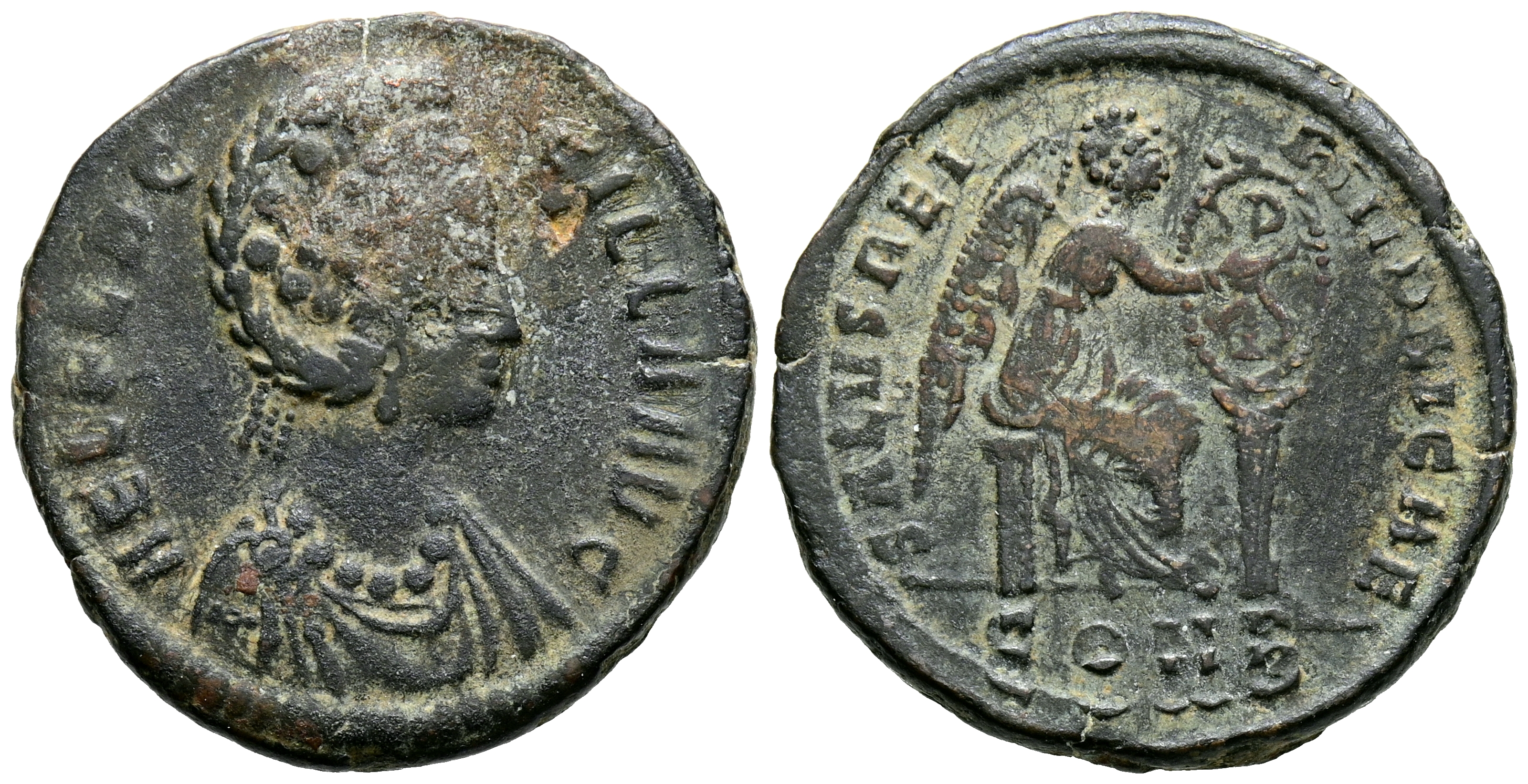 AELIA FLACILLA. Follis. (Ae. 5,41g/23mm). 383-386 d.C. Constantinopla. (RIC 55). Anv: Busto diademado y drapeado de Aelia Flacilla a derecha, alrededor leyenda: AEL FLACILLA AVG. Rev: Victoria sentada a derecha inscribiendo Chi-Rho en escudo sobre co lumna, en exergo: CONS, alrededor leyenda: SALVS REI PVBLICAE. MBC-.