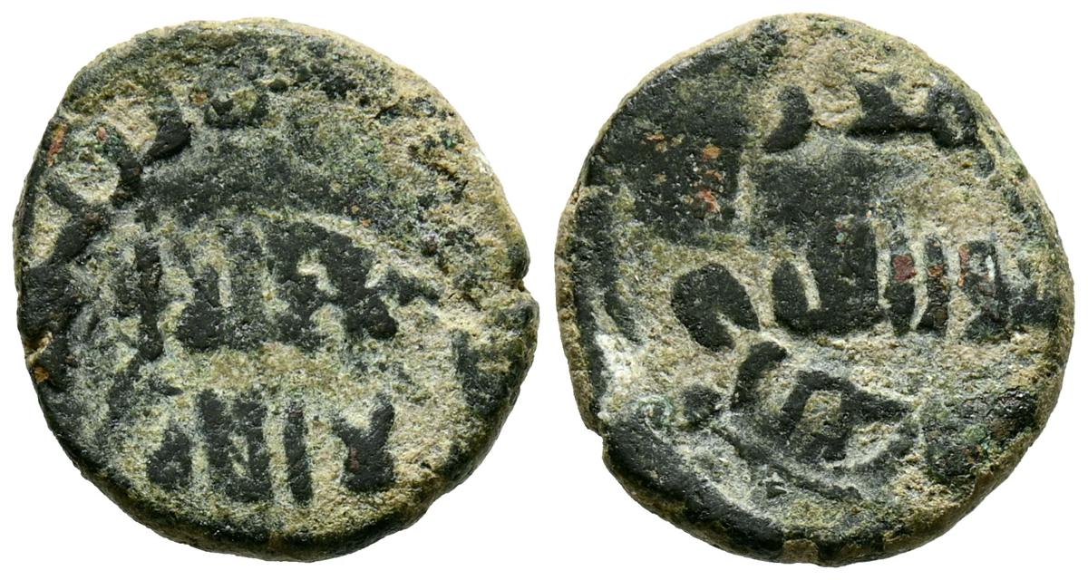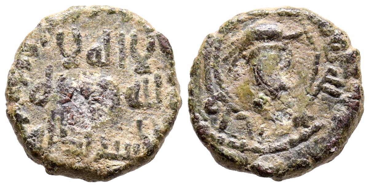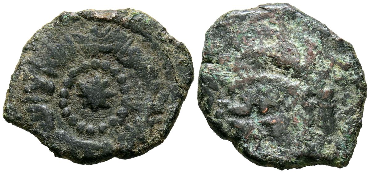 EMIRATO DEPENDIENTE DE CÓRDOBA, ÉPOCA DE LOS GOBERNADORES. Anónimo. Felús. (Ae. 2.14g/6mm). S/D. (Frochoso XIV-a; Walker-Th12). Obv: 'Sahada' en tres líneas rodeadas por un abalorio de hojas. Rev: Cabeza de guerrero mirando hacia la derecha, rodeada por la misión profética de Muhammad. MBC.