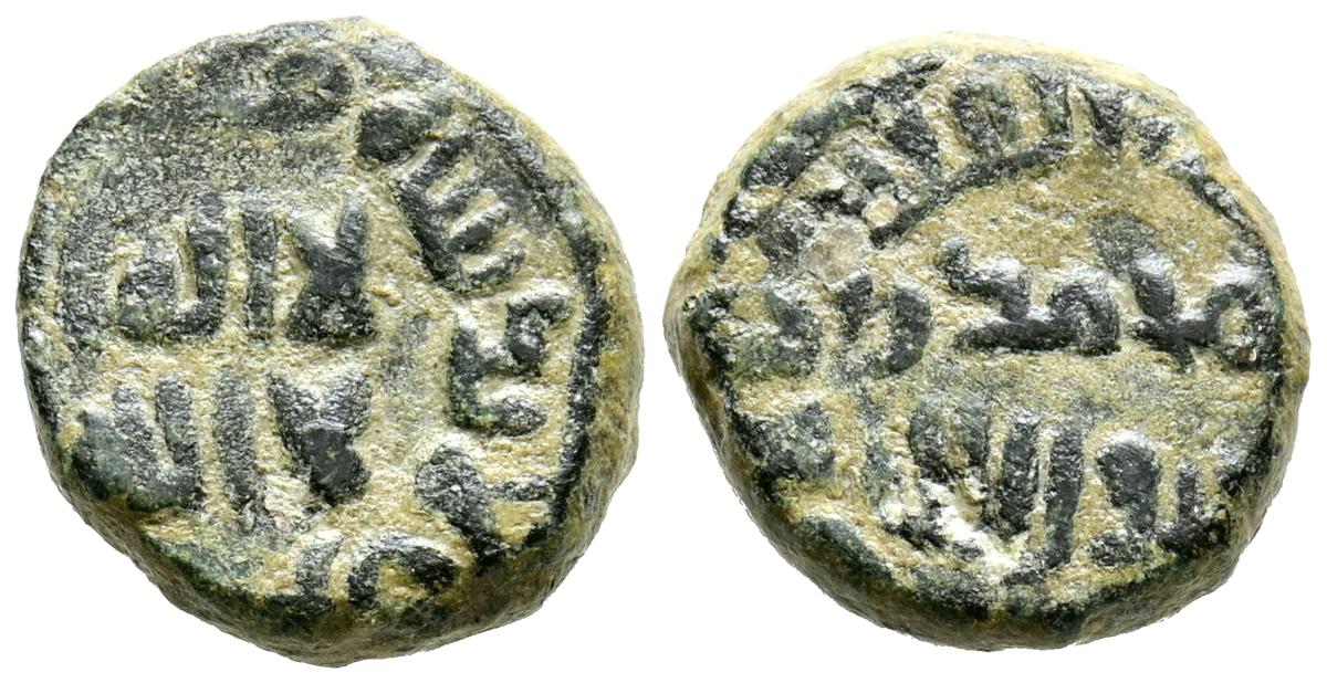 EMIRATO DEPENDIENTE DE CÓRDOBA, PERIODO DE GOBERNADORES. Anónimo. Felús. (Ae. 2,24g/14mm). S/D. al-Ándalus / الاندلس. (Vives 41; Frochoso XVIII-e). Anv: لاالله/ لااله ا. Rev: رسواالله / محمد. Rev: Orla parcialmente visible en ambas áreas. MBC+. Escas a.