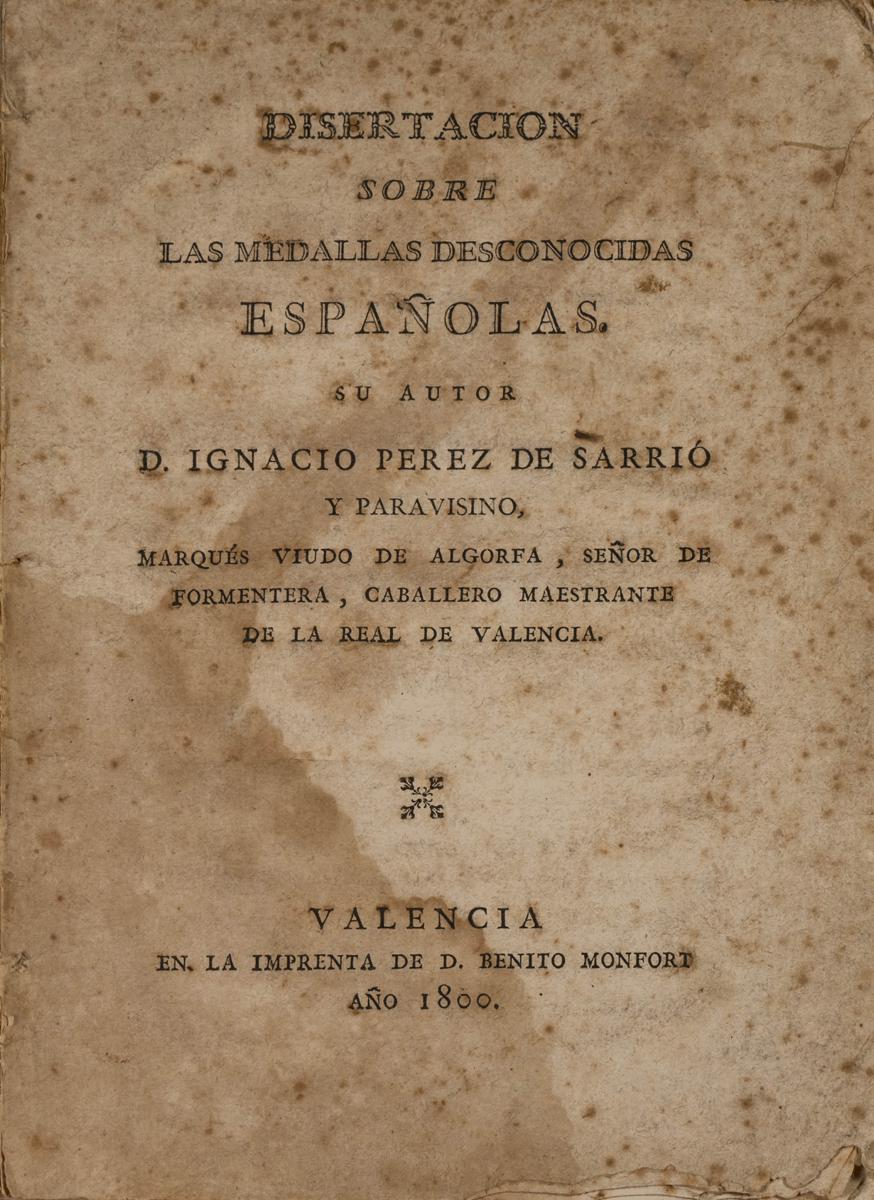 DISERTACIÓN SOBRE LAS MEDALLAS DESCONOCIDAS ESPAÑOLAS. D. Ignacio Pérez de Sarrió. 1800. Valencia. Ejemplar incompleto, a falta de las dos útimas páginas. Aún así excelente y valioso ejemplar. Ajustado estado de conservación en relación a su antigüedad con algunas manchas de humedad y anotaciones manuscritas. A EXAMINAR.