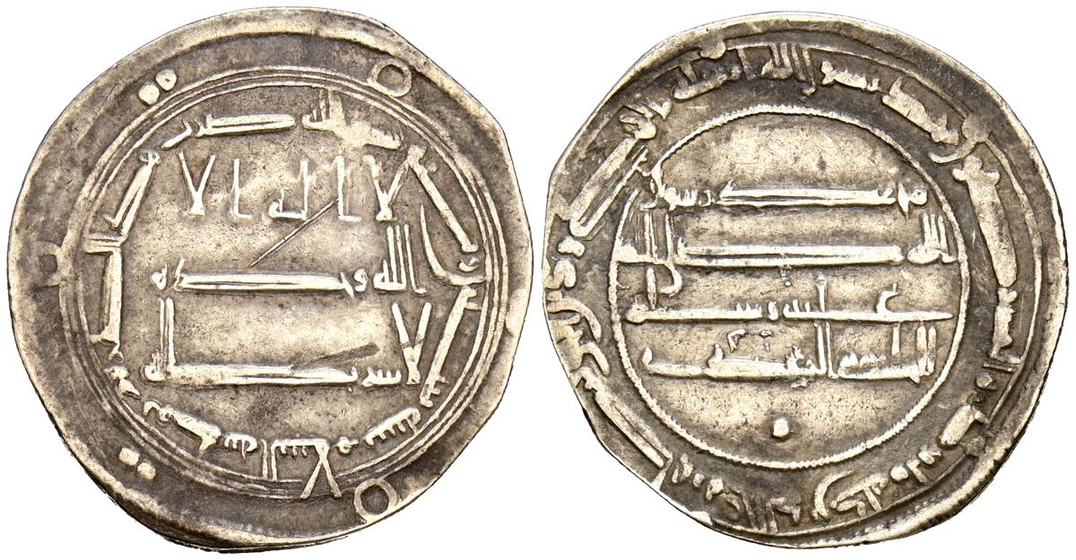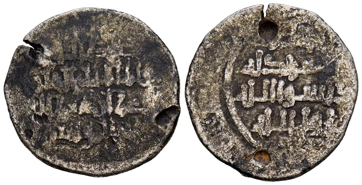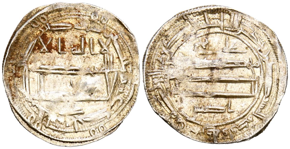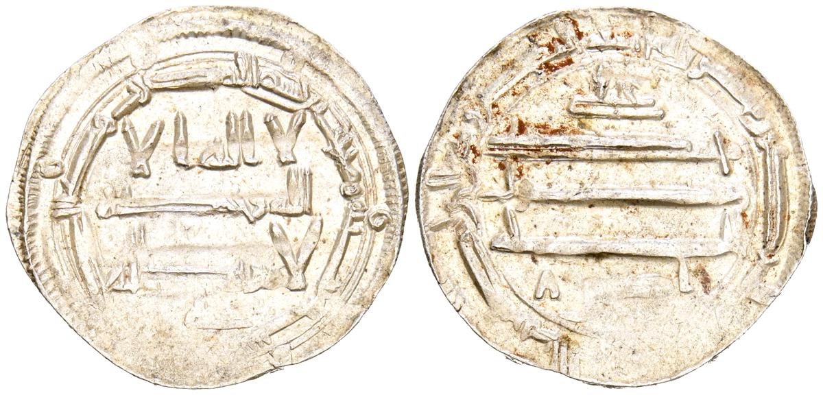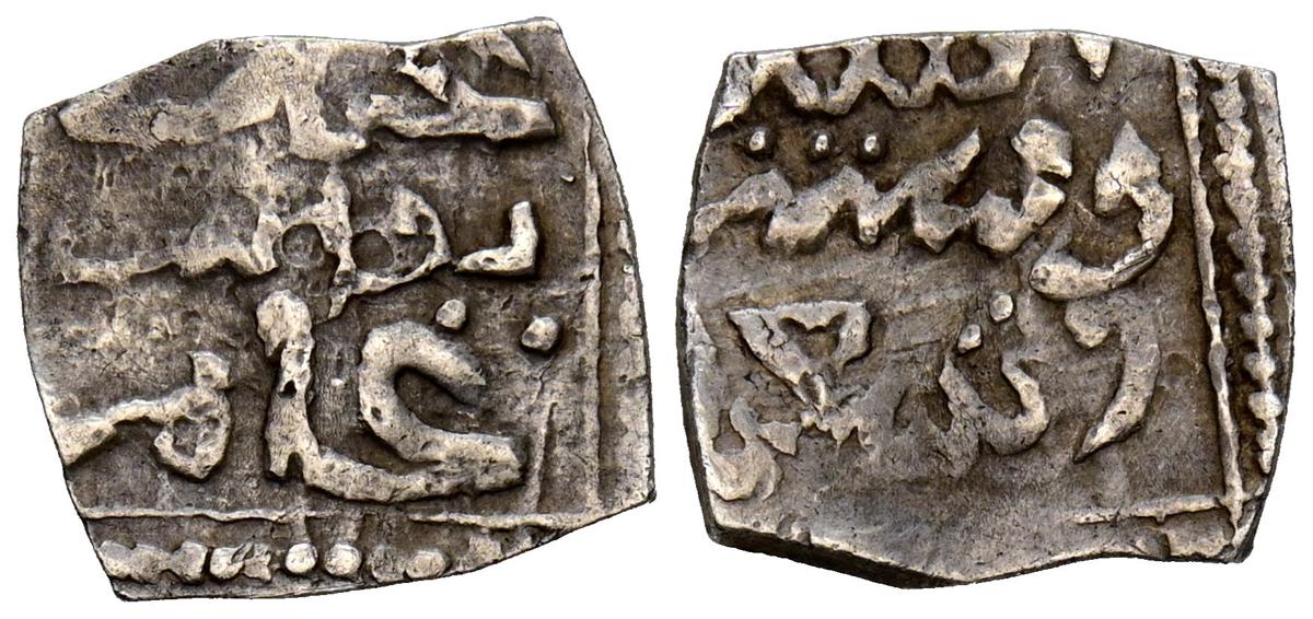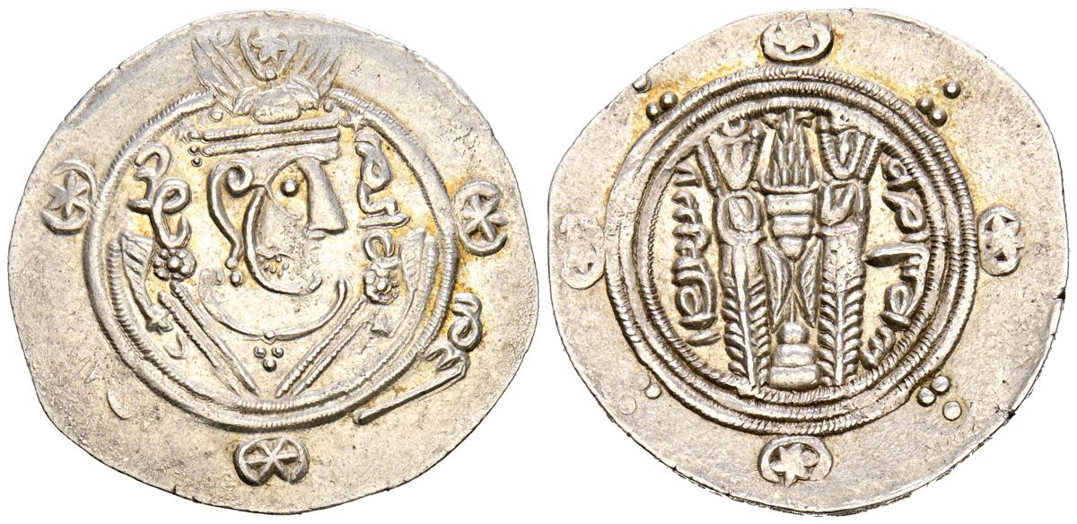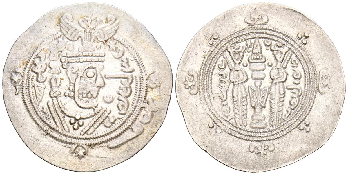 CALIFATO ABASIDA, Anónimo. Dirham Tabarí. (Ar. 1,96g/23mm). 128 PYE/163H/779 d.C. Tabaristán. (Álbum73). Anv: Busto con corona alada mirando a derecha de tipo sasánida, leyenda en palavhi: a la derecha, ABZUD (Crecimiento) y a la izquierda, GDH (Explendor). En el exterior, a las 2h, 6h y 10h, creciente y estrella. Abajo a la derecha la palabra palavhi: ADB (Excelente) y a izquierda NEK (Bueno). Rev: Altar de fuego flanqueado por dos sacerdotes, a la derecha: Tapurstan (Tabaristán), y a izquierda año de acuñación: 128 PYE (Post Yazgard Era) dentro de 3 orlas, en el exterior, a las 12h, 3h, 6h y 9h creciente y estrella, y en medio de estos adornos 3 puntos en forma de triángulo. MBC/MBC+.