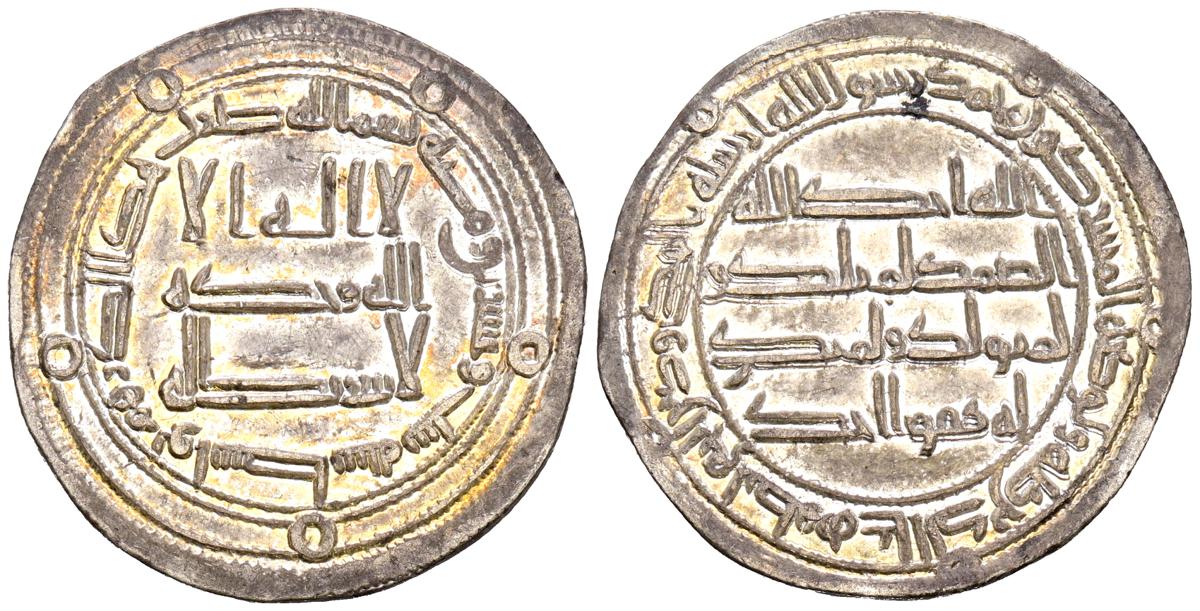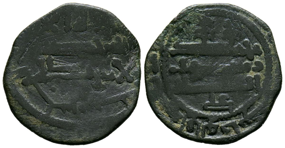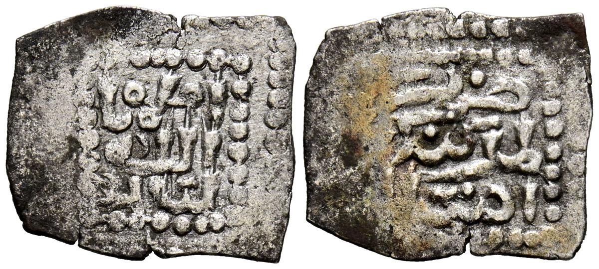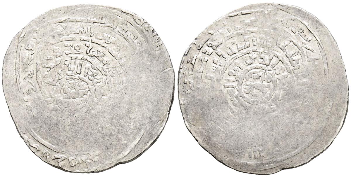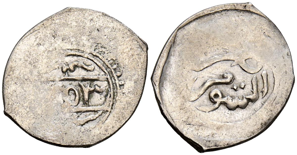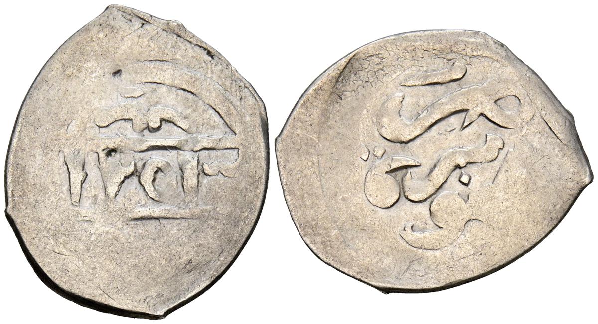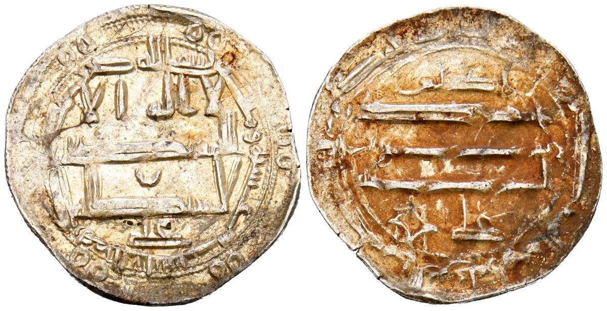 CALIFATO ABASIDA, Anónimo. Dirham Tabarí. (Ar. 1,96g/23mm). 128 PYE/163H/779 d.C. Tabaristán. (Álbum73). Anv: Busto con corona alada mirando a derecha de tipo sasánida, leyenda en palavhi: a la derecha, ABZUD (Crecimiento) y a la izquierda, GDH (Explendor). En el exterior, a las 2h, 6h y 10h, creciente y estrella. Abajo a la derecha la palabra palavhi: ADB (Excelente) y a izquierda NEK (Bueno). Rev: Altar de fuego flanqueado por dos sacerdotes, a la derecha: Tapurstan (Tabaristán), y a izquierda año de acuñación: 128 PYE (Post Yazgard Era) dentro de 3 orlas, en el exterior, a las 12h, 3h, 6h y 9h creciente y estrella, y en medio de estos adornos 3 puntos en forma de triángulo. MBC/MBC+.
