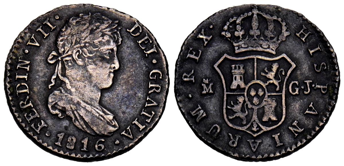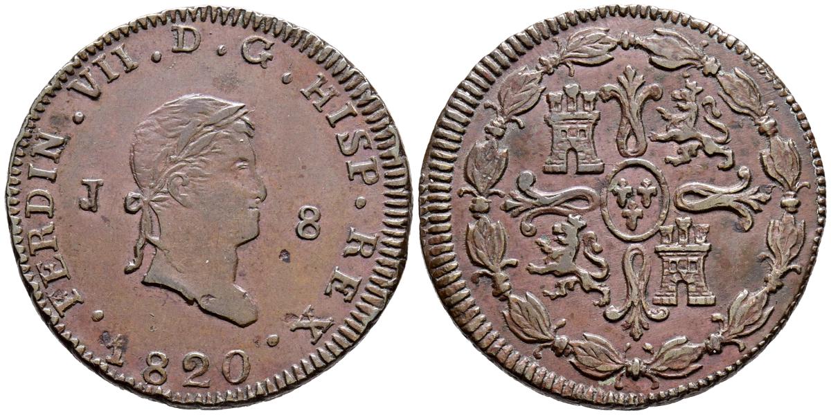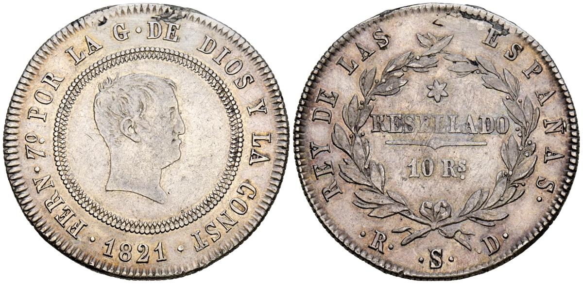 FERNANDO VII (1808-1833). 10 Reales (Ar. 13,28g/34mm). 1821. Sevilla RD. (Cal-2019-1138). Tipo cabezón. MBC. Restos de soldadura, aún así la pieza presenta un alto nivel de conservación para este tipo de piezas, sin vanos reseñables, y restos de brillo original.