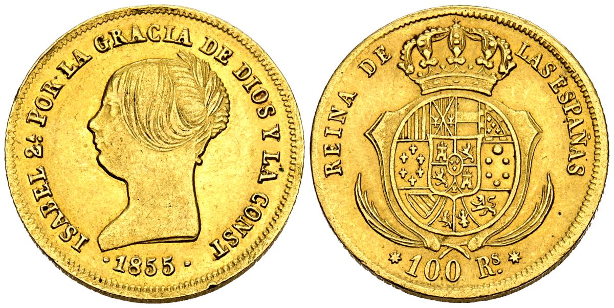 ISABEL II (1833-1868). 100 Reales. (Au. 8,35g/22mm). 1855. Sevilla. (Cal-2019-796). MBC/MBC+.
