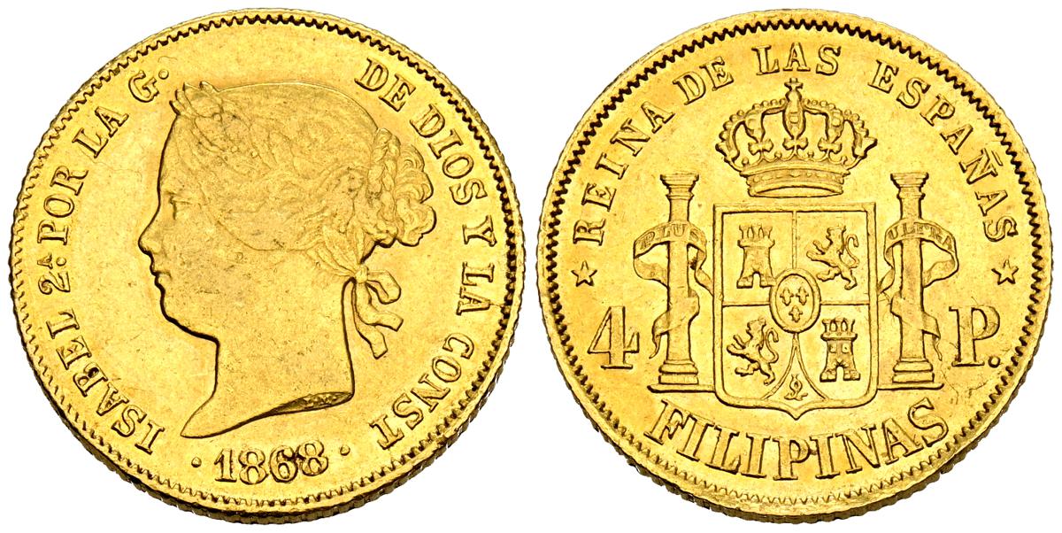 ISABEL II (1833-1868). 4 Pesos. (Au 6,773 /21mm). 1868/58. Manila. (Cal-2019-864). MBC/MBC+.