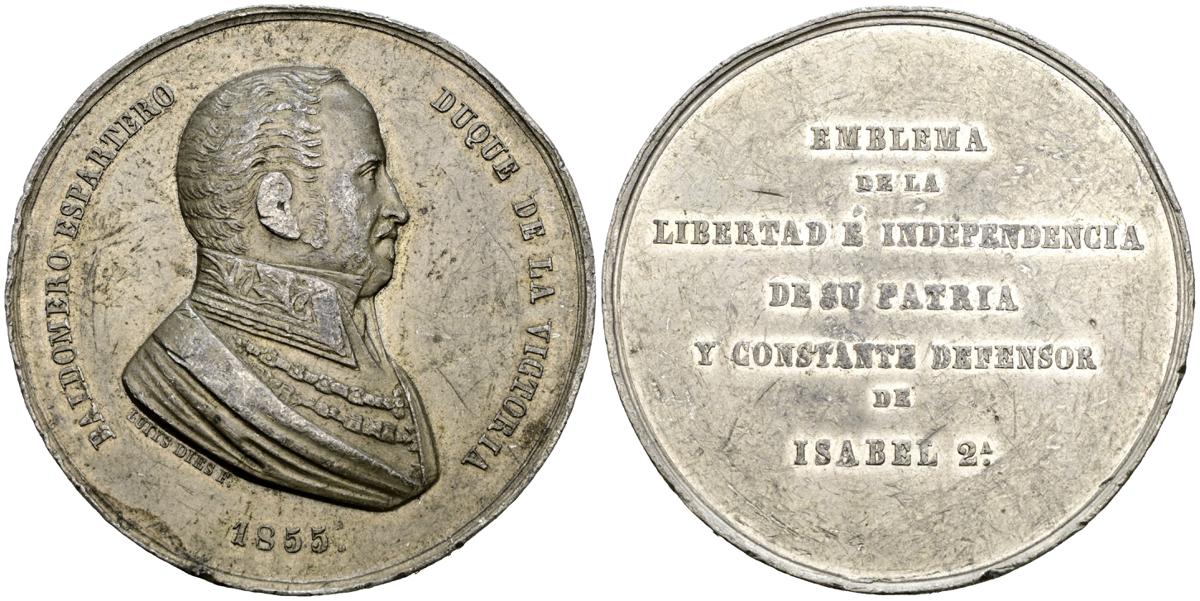 ISABEL II (1833-1868). B. Espartero, Duque de la Victoria (Metal Blanco. 112,21g/62mm). 1855. Grabador: Luiys Dies. (Vives 7998). MBC+. Golpes en el canto.
