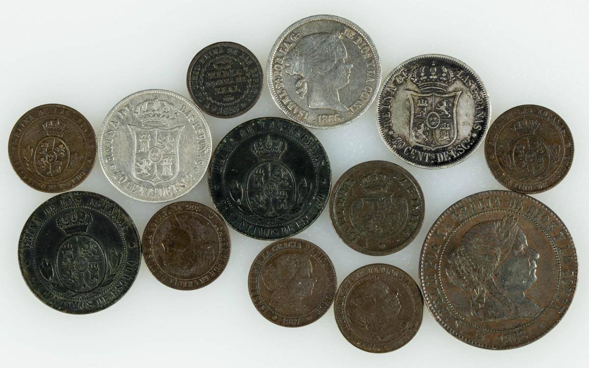 ISABEL II (1833-1868). Interesante y bonito conjunto formado 13 piezas (10 de ellas en cobre y 3 en plata) sin monedas repetidas y con variedad de fechas y cecas. Diferentes estados de conservación. A EXAMINAR.