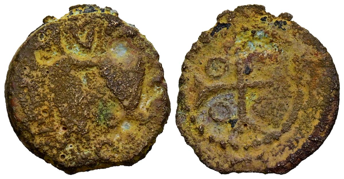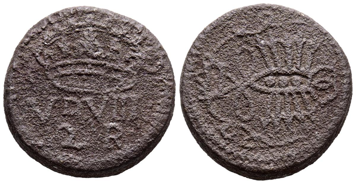 Ponderal de 2 reales. (Ae. 6,03g/17mm). S/D. (Mateu y Llopis-45 anv.). Anv: VDVIIIG / ·2·R·. Bajo corona real. Rev: Yugo y flechas. MBC