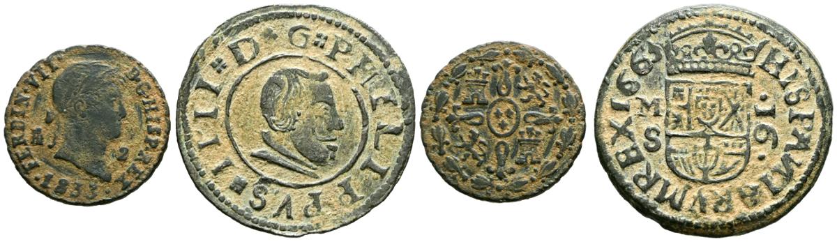 MONARQUIA ESPAÑOLA. Interesante pareja de cobres acuñados bajos los reinados de Felipe IV y Fernando VII, con módulos de 16 y 2 Maravedís respectivamente. Diferentes modulos, medidas y estados de conservación. A EXAMINAR.