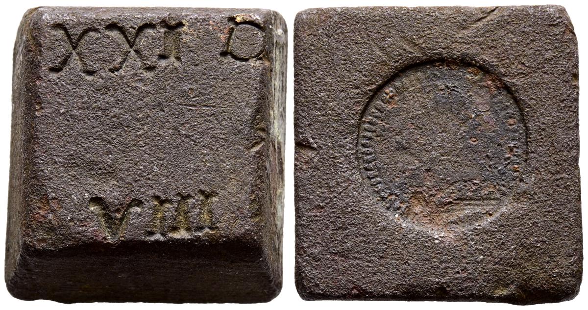 Ponderal de 8 reales. (Ae. 26,11g/21mm). S/D. (Mateu y Llopis-45 anv.). Anv: XXI D / VIII. Rev: Yugo y flechas. MBC.