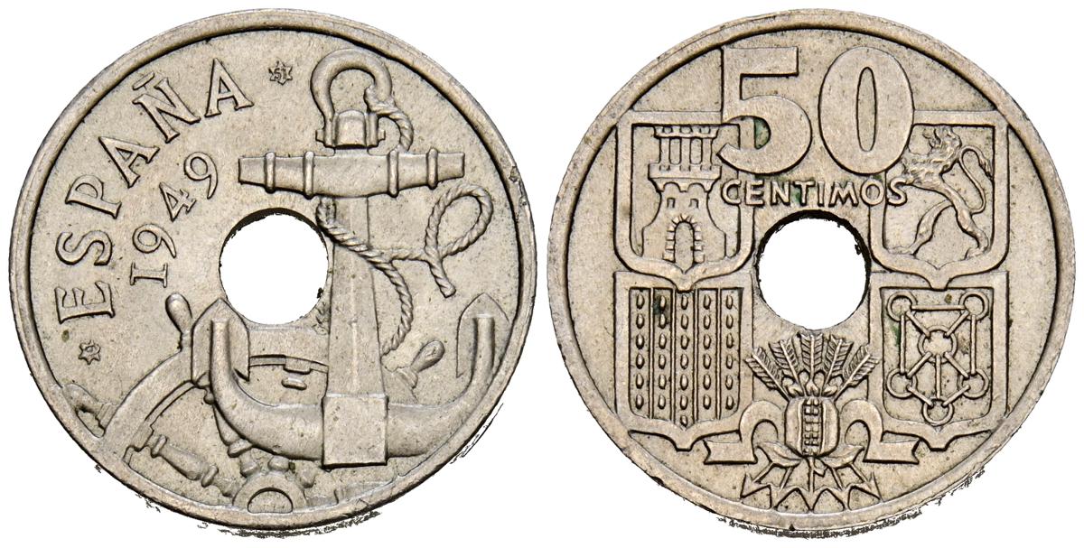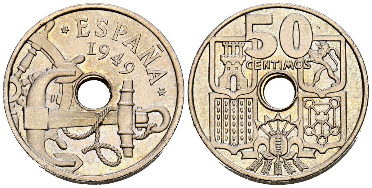 ESTADO ESPAÑOL (1936-1975). 50 Céntimos. (Ae-Ni. 4,14g/20mm). 1949 *19-51. Madrid. (Cal-2019-21). Variante: Flechas invertidas. SC.