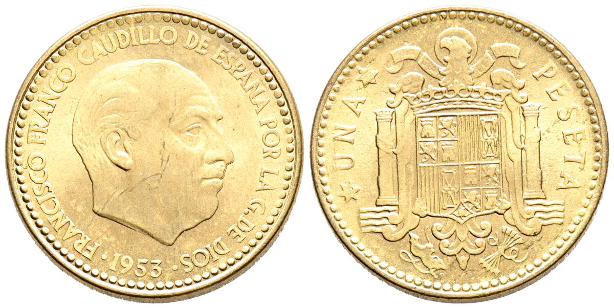 ESTADO ESPAÑOL (1936-1975). 1 Peseta. (Al-Ae. 3,76g/20mm). 1953 *19-61. Madrid. (Cal-2019-60). SC-. Precioso tono.