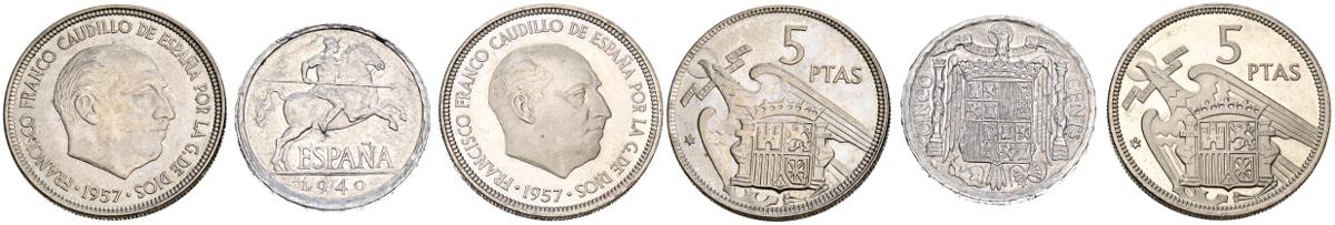 ESTADO ESPAÑOL (1936-1975). Conjunto de tres piezas; 5 Céntimos 1940 y 5 pesetas 1957 (x2). Diferentes módulos y pesos. EBC- y S/C.