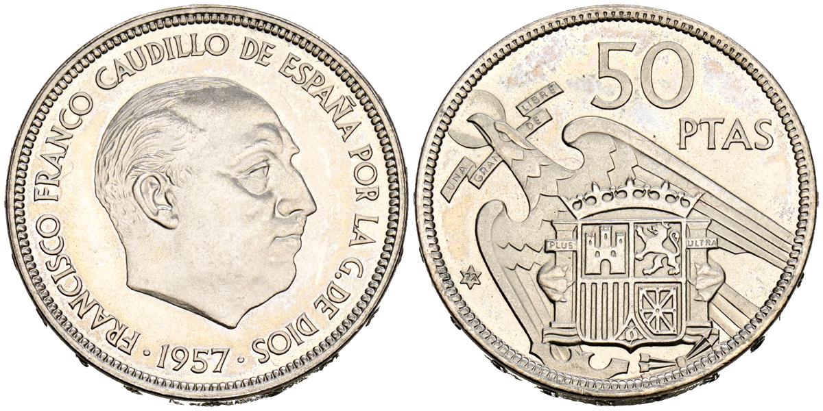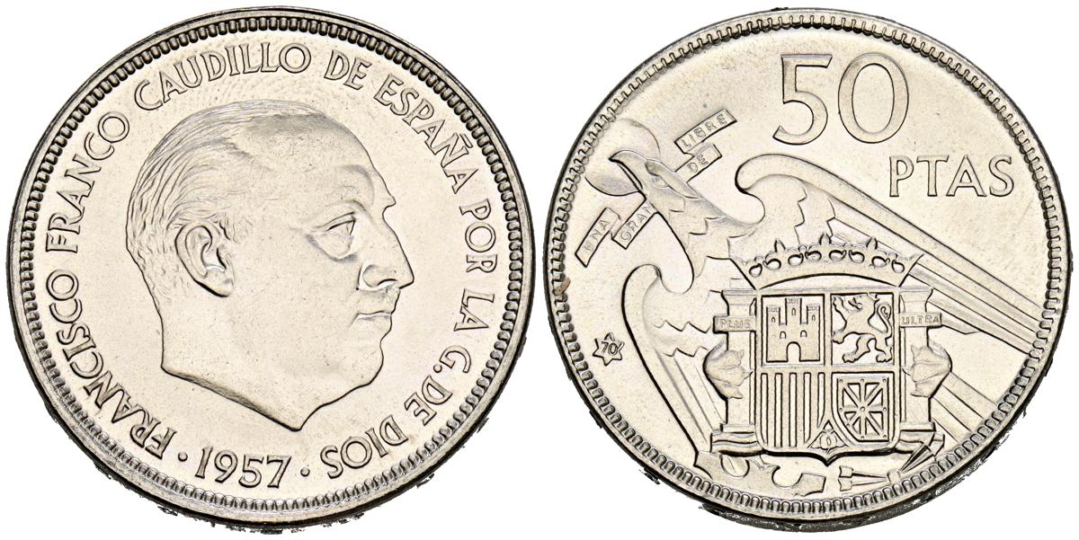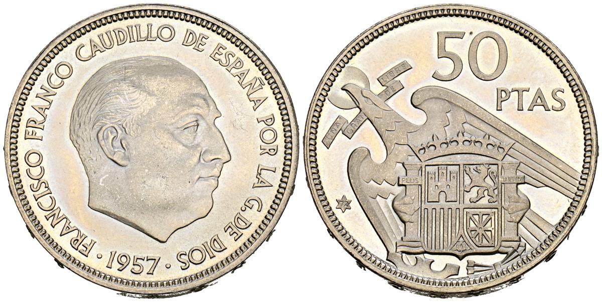 ESTADO ESPAÑOL (1936-1975). 50 Pesetas. (Ni. 12,51g/30mm). 1957 *70. Madrid. (Cal-2019-139). SC. Extraída de tira. Escasa.