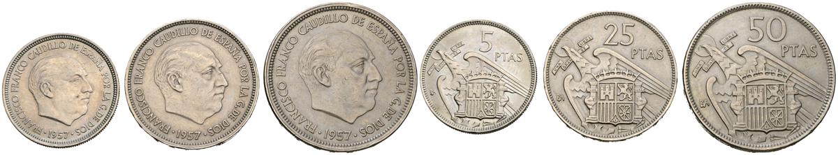 ESTADO ESPAÑOL (1936-1975). 5, 25 y 50 Pesetas. 1957 *BA. Barcelona. Serie completa emitida en la I Exposición Iberoamericana de Numismática y Medallística de Barcelona. (Cal-2019-154/155/156). Diferentes estados de conservación. A EXAMINAR.