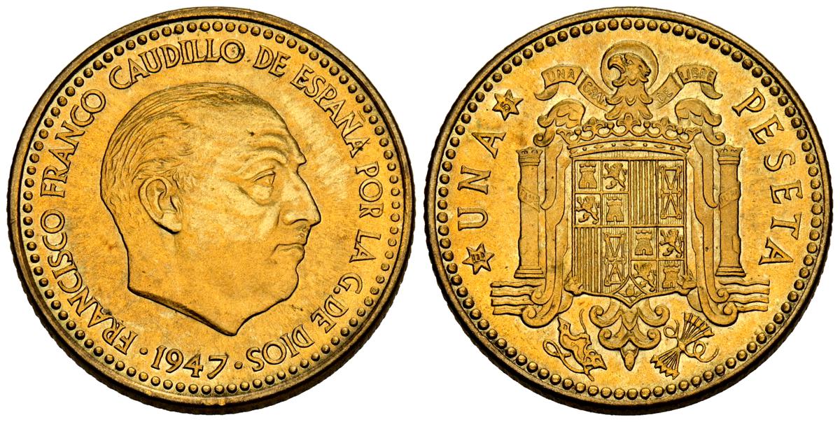 ESTADO ESPAÑOL (1936-1975). 1 Peseta. (Al-Ae. 3,31g/21mm). 1947 *E-51. Madrid. II Exposición Nacional de Numismática. (Cal-2019-152). SC. Preciosa tonalidad dorada.