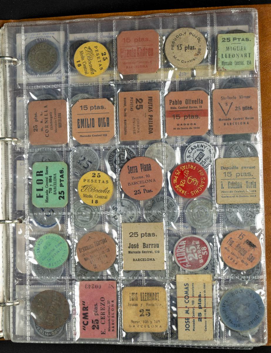 Magnífica colección formada por alrededor de 150 fichas y vales en su gran mayoría barcelonesas y sin piezas repetidas. En el conjunto encontramos fichas en cartón, en zinc y otros materiales, con una buena represetación de fichas coloreadas, que podemos datar en su conjunto entre los años 50 y 60 del siglo pasado. Destaca una preciosa selección de fichas del mercado barcelonés del Borne, que fue durante una etapa el mercado central de Barcelona en lo que a fruta y verdura se refiere. Se completa la colección con una amplia y variada presencia de fichas de cooperativas, del primer tercio del siglo XX, entre las que encontramos algunas tan emblemáticas como "La Dignidad", "El Reloj" o la "Unión Cooperativa Barcelonesa". La colección se presenta en un único ábum e incluye algunas piezas consideradas escasas. Diferentes estados de conservación. A EXAMINAR.