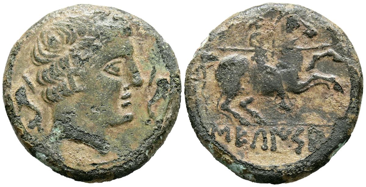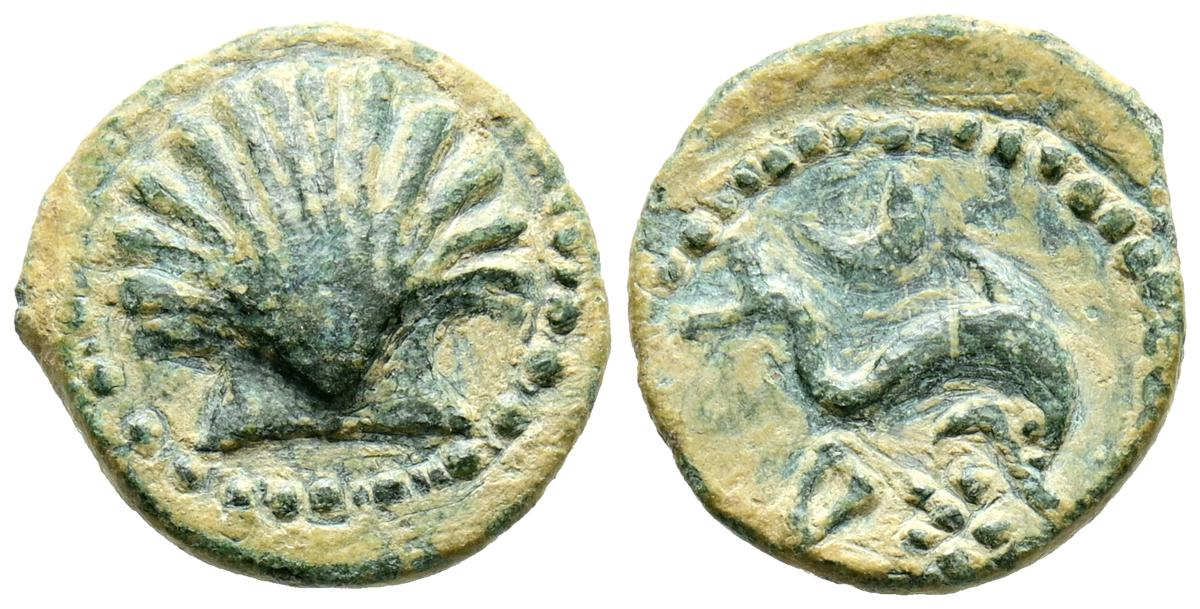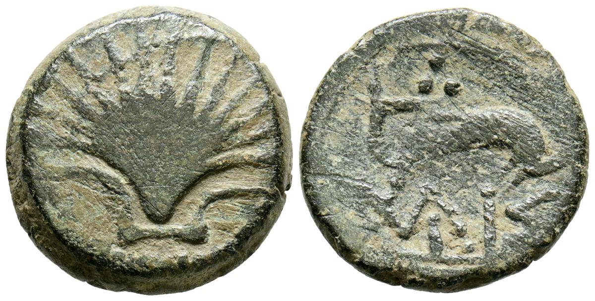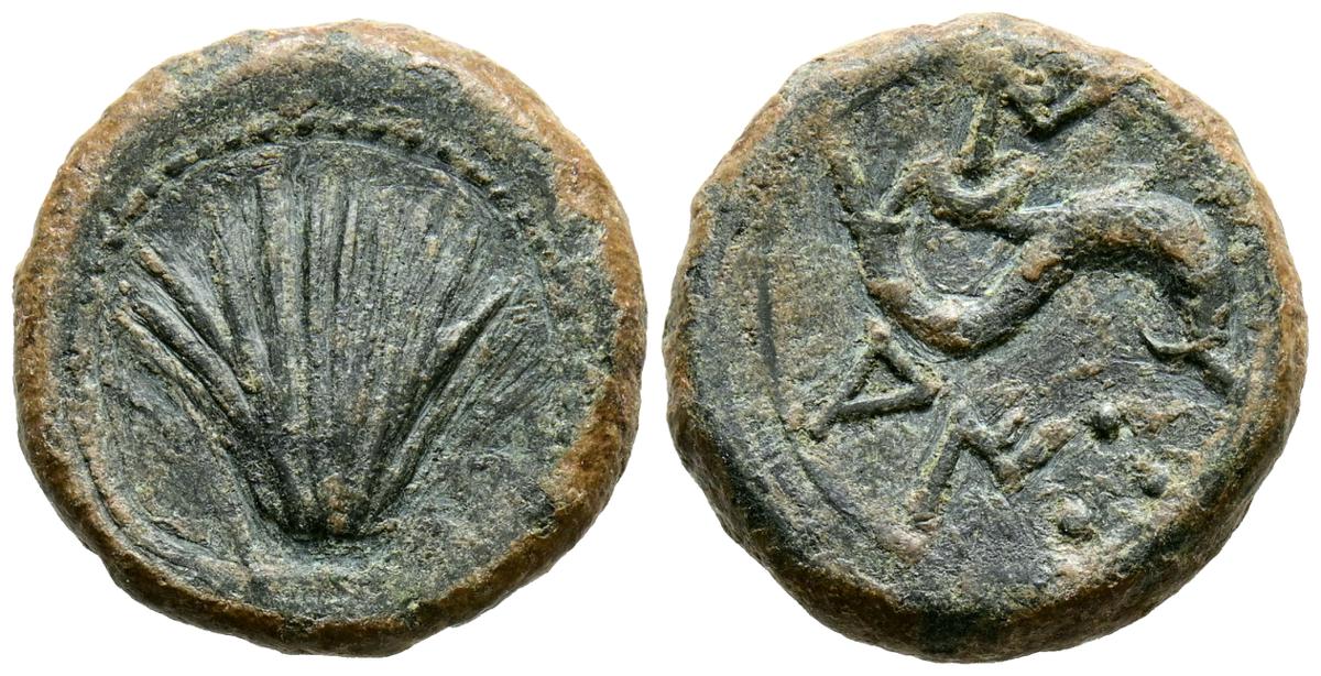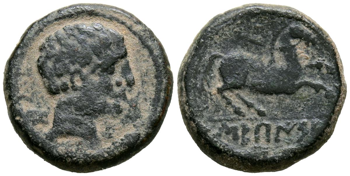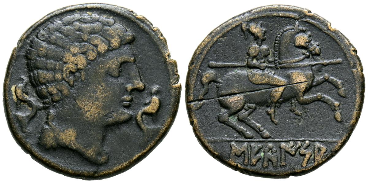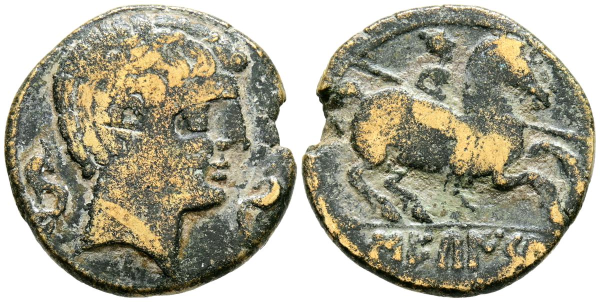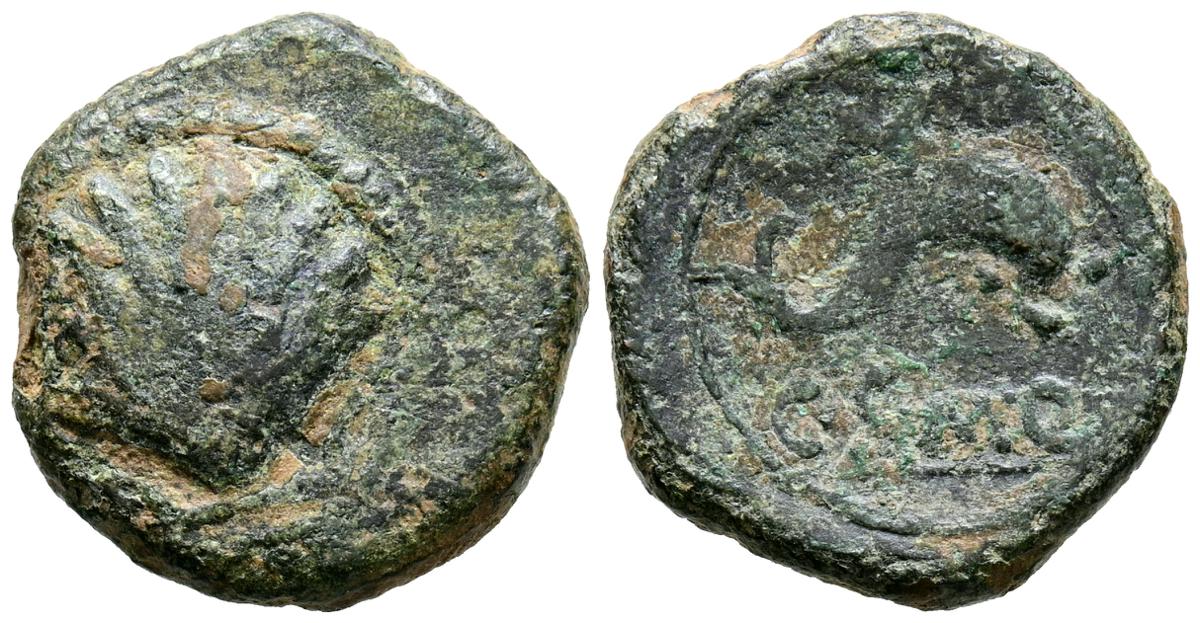 SEGIA, (Ejea de los Caballeros, Zaragoza). As. (Ae. 10,27g/23mm). 120-20 a.C. (FAB-2157). Anv: Cabeza masculina barbada y con collar a derecha, detrás dos delfines. Rev: Jinete lancero a derecha, encima creciente y estrella, debajo sobre línea: SEGIA. MBC-. Curioso ejemplar con aparentes restos de un baño de plata en reverso.