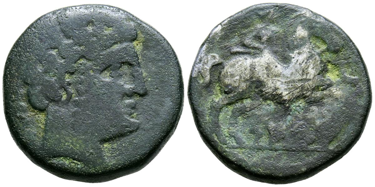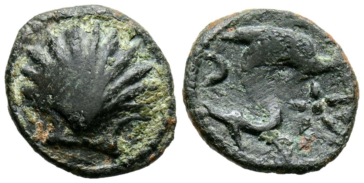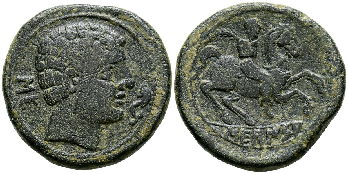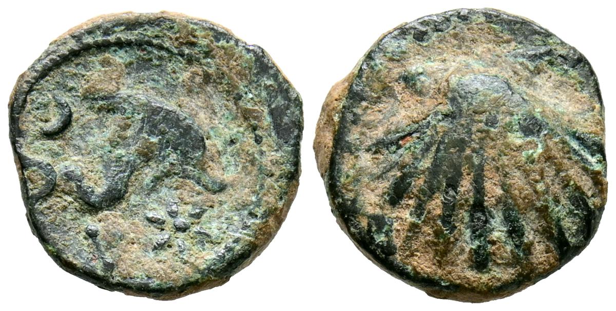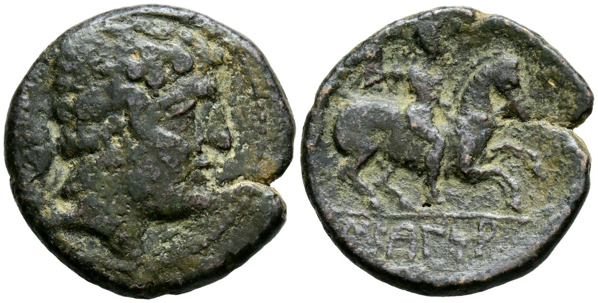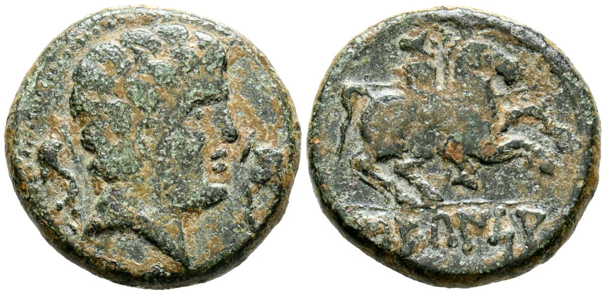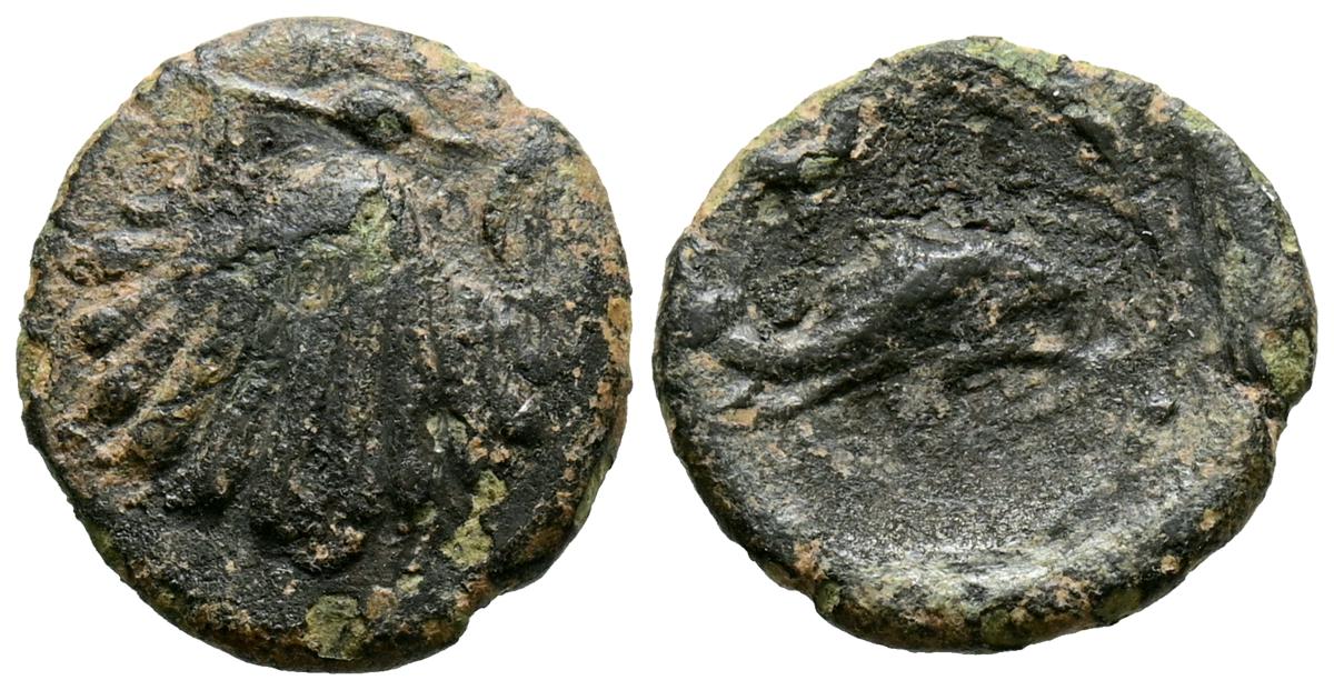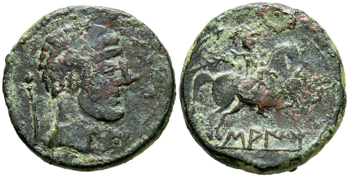 SEGIA, (Ejea de los Caballeros, Zaragoza). As. (Ae. 10,27g/23mm). 120-20 a.C. (FAB-2157). Anv: Cabeza masculina barbada y con collar a derecha, detrás dos delfines. Rev: Jinete lancero a derecha, encima creciente y estrella, debajo sobre línea: SEGIA. MBC-. Curioso ejemplar con aparentes restos de un baño de plata en reverso.